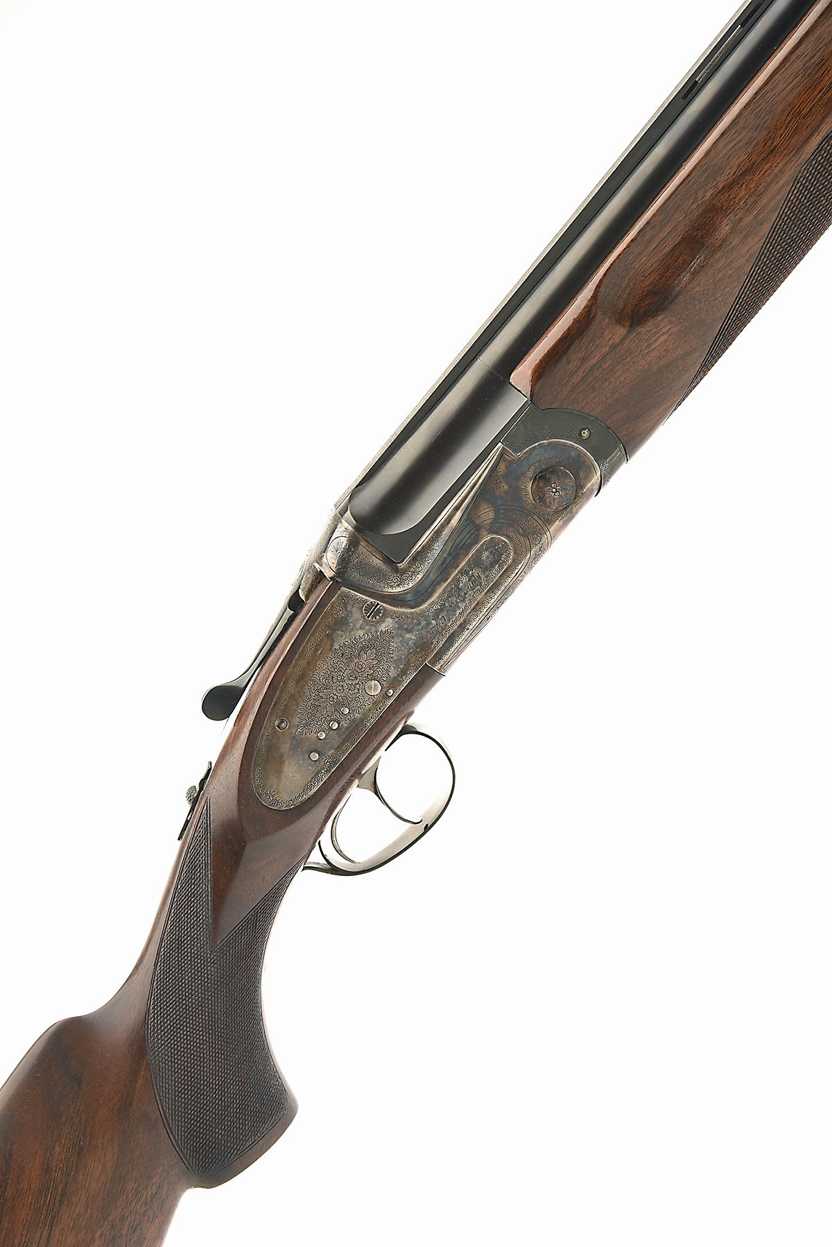 extra 26in. nitro barrels with 7mm ventilated matt top-rib, 2 3/4in. chambers, bored approx. true cyl. in both, hold-open toplever, automatic safety with engraved 'S' detail, bolstered action, border, acanthus scroll and floral bouquet engraving, retaining much original colour-hardening and finish, 14 1/4in. pistolgrip stock cast off towards central vision, semi-beavertail fore-end, weight 8lb. 4oz. (30in.) & 7lb. 5oz. (26in.), in a Liddersdale canvas slip