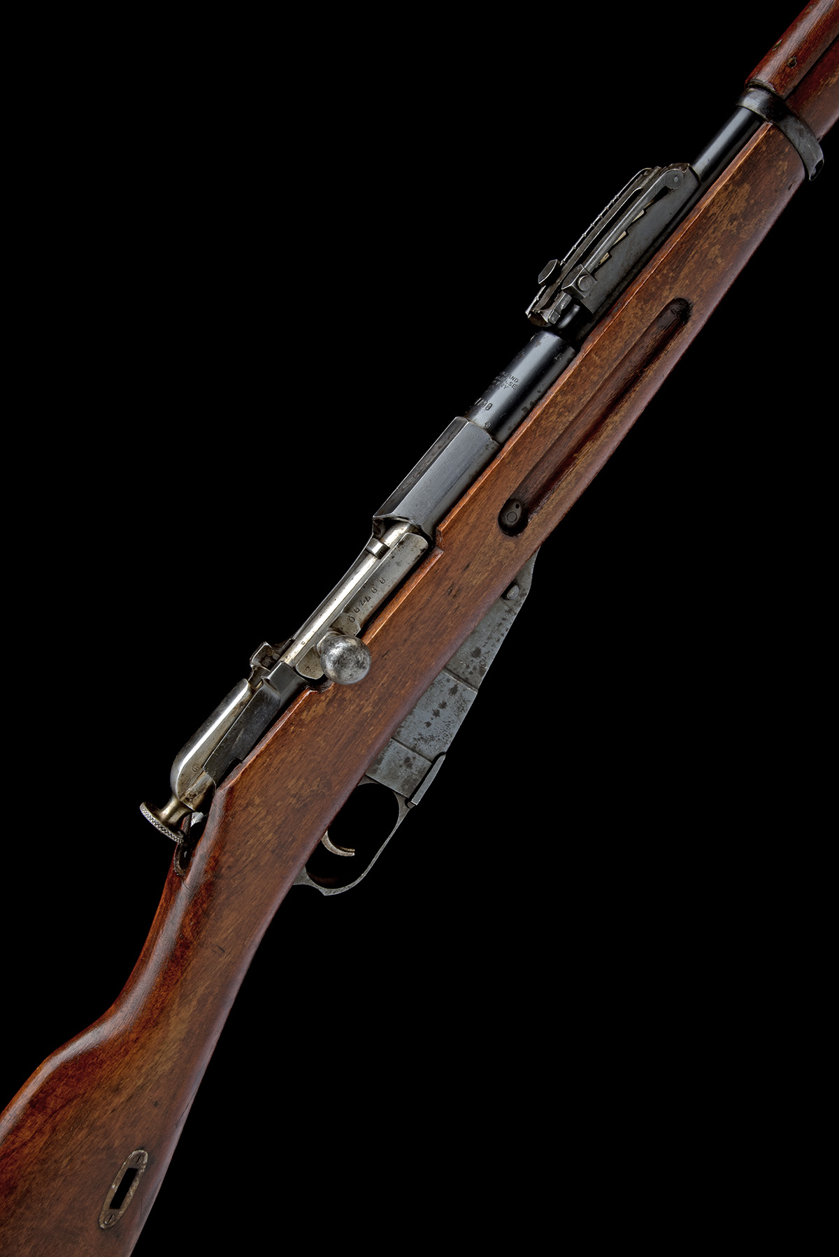 dated 1915, 32 1/4in. nitro reproved barrel (in 2025, with proof certificate), Konovalov adapted rear sight graduated from 13-32 hundred arshini on the underside, block and blade fore-sight, barrel ring engraved 'NEW ENGLAND WESTINGHOUSE COMPANY. 1915 NO. 997790.', hexagonal receiver, straight bolt with arrowed E marking, hinged magazine, three-quarter length stock, 13 3/8in. pull including steel buttplate, weight 9lb. 9oz., the whole retaining strong amounts of original finish