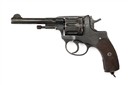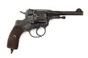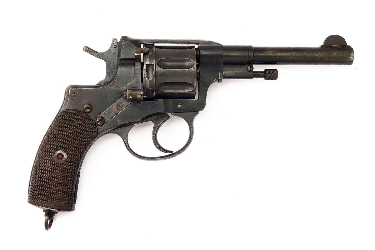 Imperial issue dated for 1905, with blued 4 1/2in. barrel, ramp fore-sight with dove-tailed crescent blade, crane ejector mounted around the barrel, solid frame, reciprocating blind-fluted 'gas-seal' seven-shot cylinder, the side-plate with cyrillic maker markings and date, chequered walnut grips, no WW2 re-issue marks, strong amount of finish, together with a WW1 period Imperial full-flap leather holster, the flap covering an ammunition pouch, with certificate of proof dated 2025