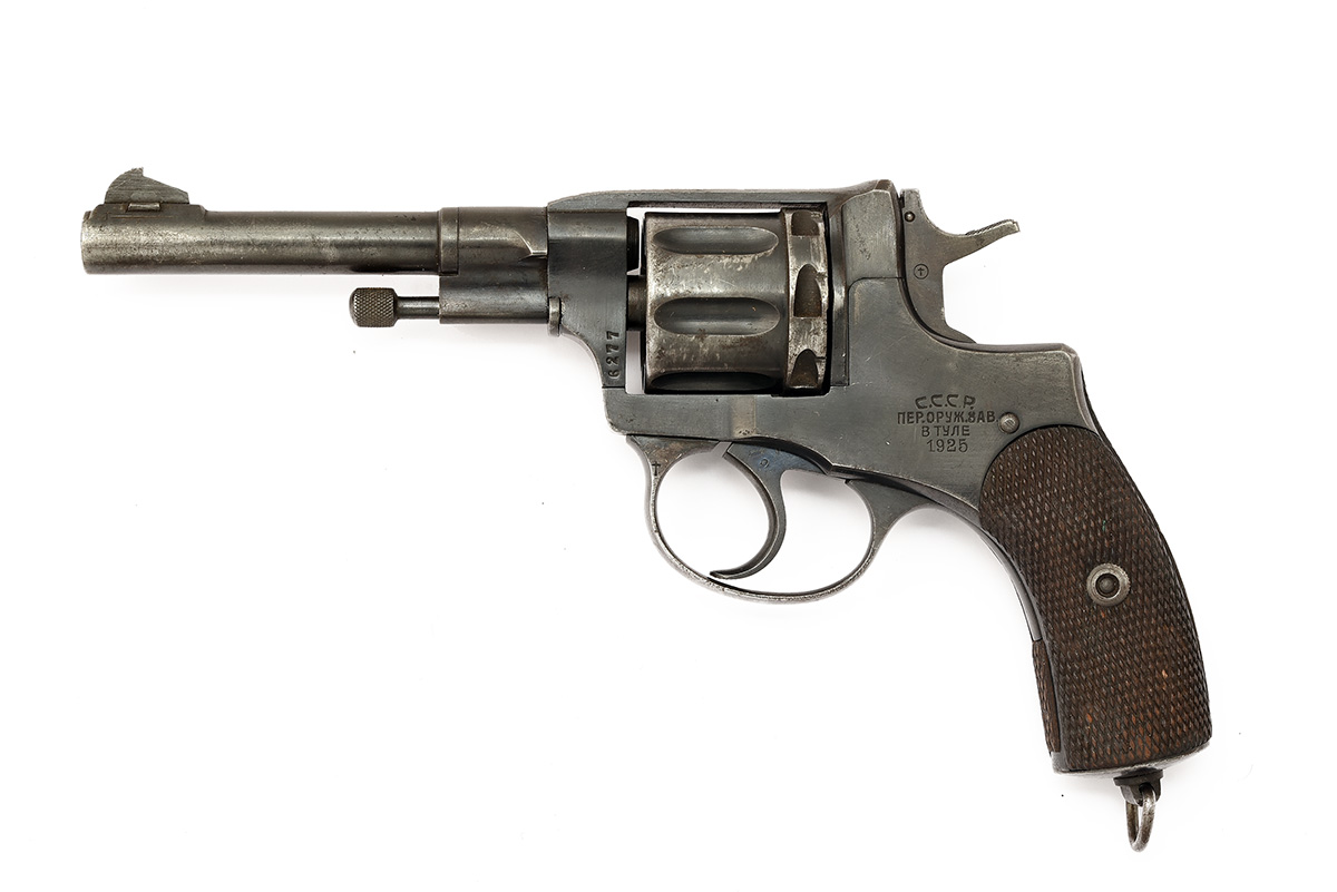 dated for 1925, with blued 4 1/2in. barrel, ramp fore-sight, crane ejector mounted around the barrel, solid frame, reciprocating blind-fluted 'gas-seal' seven-shot cylinder, the side-plate with 'CCCP', maker and date markings, no WW2 re-issue marks, strong amount of finish, together with a WW1 period Imperial full-flap leather holster, the flap with later embossed 'hammer and sickle' marks and a certificate of proof dated 2025