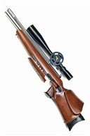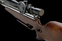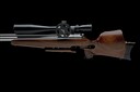 circa 2005, with polished stainless 19 1/2in. barrel including built-on muzzle-break, polished alloy bolt-action receiver (currently not cocking), polished stainless under-barrel air-reservoir, in a Gary Canes style walnut thumbhole right-hand three-quarter stock with adjustable heel-pad and palm-shelf and fitted with a Merlin Optics 10-40x56 telescopic sight, the whole in an abs plastic foam-lined transit case