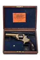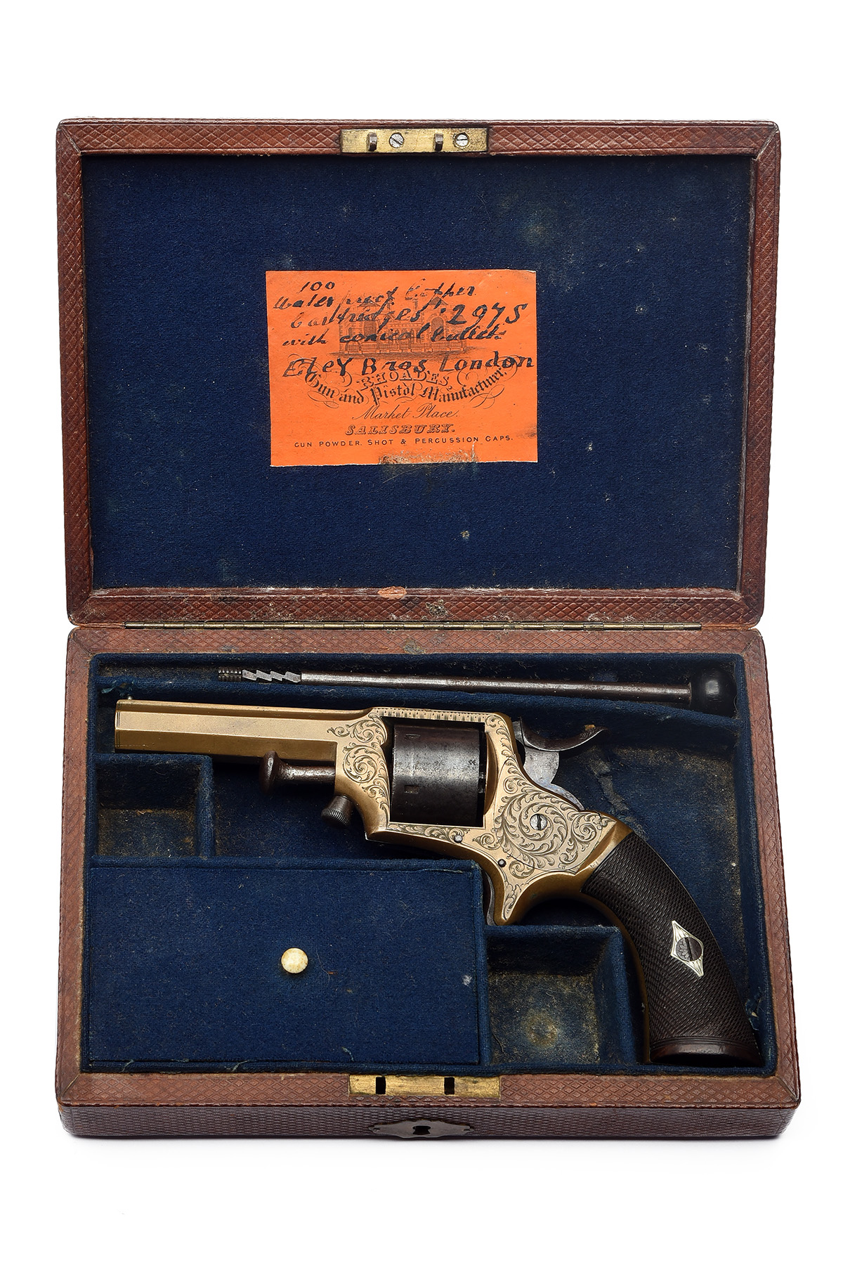 circa 1870, with octagonal 2 7/8in. barrel, shallow raised sighting rib with bead fore-sight, top-strap with standing rear-sight and signed 'RHOADES, SALISBURY', solid scroll engraved integral bronze frame, iron six-shot cylinder, spur trigger and exposed hammer, finely chequered walnut grips with scroll engraved back-strap, in its chequered leatherette-covered storage case lined and compartmented in dark blue baize, with orange 'Rhoades' trade-label inside lid and including a cleaning rod
