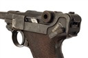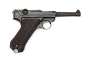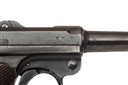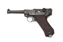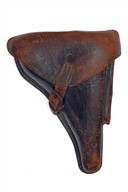 the pistol dated for 1938, with 4in. sighted barrel, receiver bridge with date, 'S/42' maker's mark to toggle, butt with provision for shoulder-stock, blacked ancillaries, chequered wood grips, all matching numbers except period aluminium-based magazine, the whole with a strong amount of original finish remaining, together with a tan leather holster for same dated '1915'