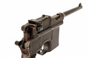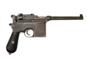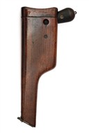 manufactured in 1910, with round 5 1/2in. barrel, block and pinched blade fore-sight, 1000 metre rear-sight, short ejector to bolt, machined receiver and frame, new style safe, integral magazine and ribbed walnut grips, finish faded, with its matching number walnut holster-stock (short blind cracks to main body), missing lanyard ring