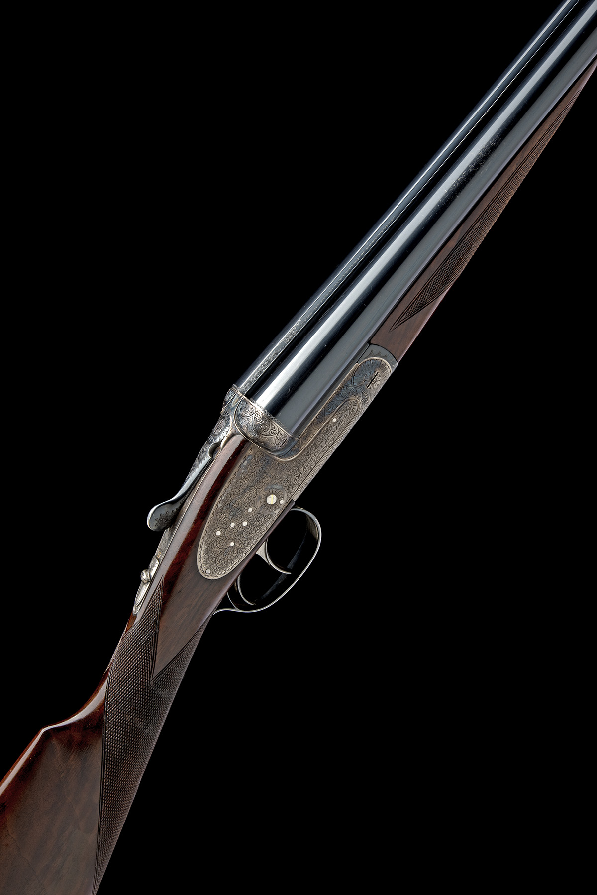 for 2001, 30in. nitro chopperlump barrels, 2 3/4in. chambers, bored approx. 1/4 and 1/2 choke, engraved arcaded fences, removable striker discs, automatic safety, gold-inlaid striker discs, articulated front trigger, rolled-edge triggerguard, acanthus scroll engraving, retaining some original colour-hardening and finish, 14 7/8in. stock, weight 6lb. 12oz.