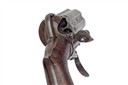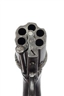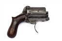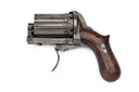 Belgian, circa 1865, with near fully fluted 1 3/4in. six-shot barrel cluster, one flute marked 'ACIER FONDU' together with the serial number, open iron frame, the front left side stamped 'INVENTION T&C' with the remainder obscured, crane-mounted ejector rod stored alongside the frame and secured by the gate-spring, double action only mechanism with folding trigger, smooth saw-handled walnut bag-shaped grip (small loss at head), slight traces of finish
