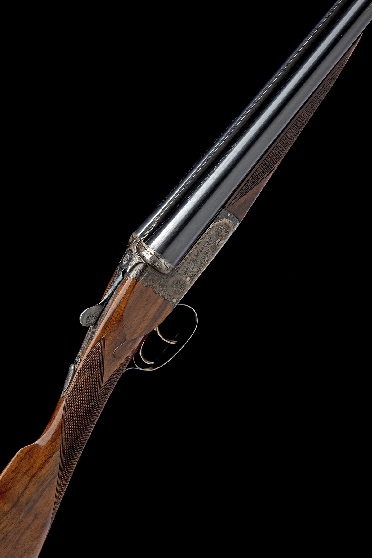 for 1972, 25in. nitro barrels, matt Churchill-rib gold-inlaid 'XXV' at the breech end, the tubes engraved 'CHURCHILL (GUNMAKERS) LTD. 7, BURY STREET, ST. JAMES'S, LONDON, ENGLAND', 2 3/4in. chambers, bored approx. 1/4 choke in both, scroll-back action with slender fences, automatic safety with gold-inlaid 'SAFE' detail, acanthus scroll engraving with floral bouquets, the sides with scrolling banners engraved 'CHURCHILL', the underside with the model designation, retaining much original colour-hardening and finish, 15 1/4in. stock including 3/4in. recoil pad, weight 6lb. 2oz., in its leather case