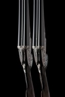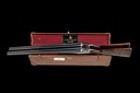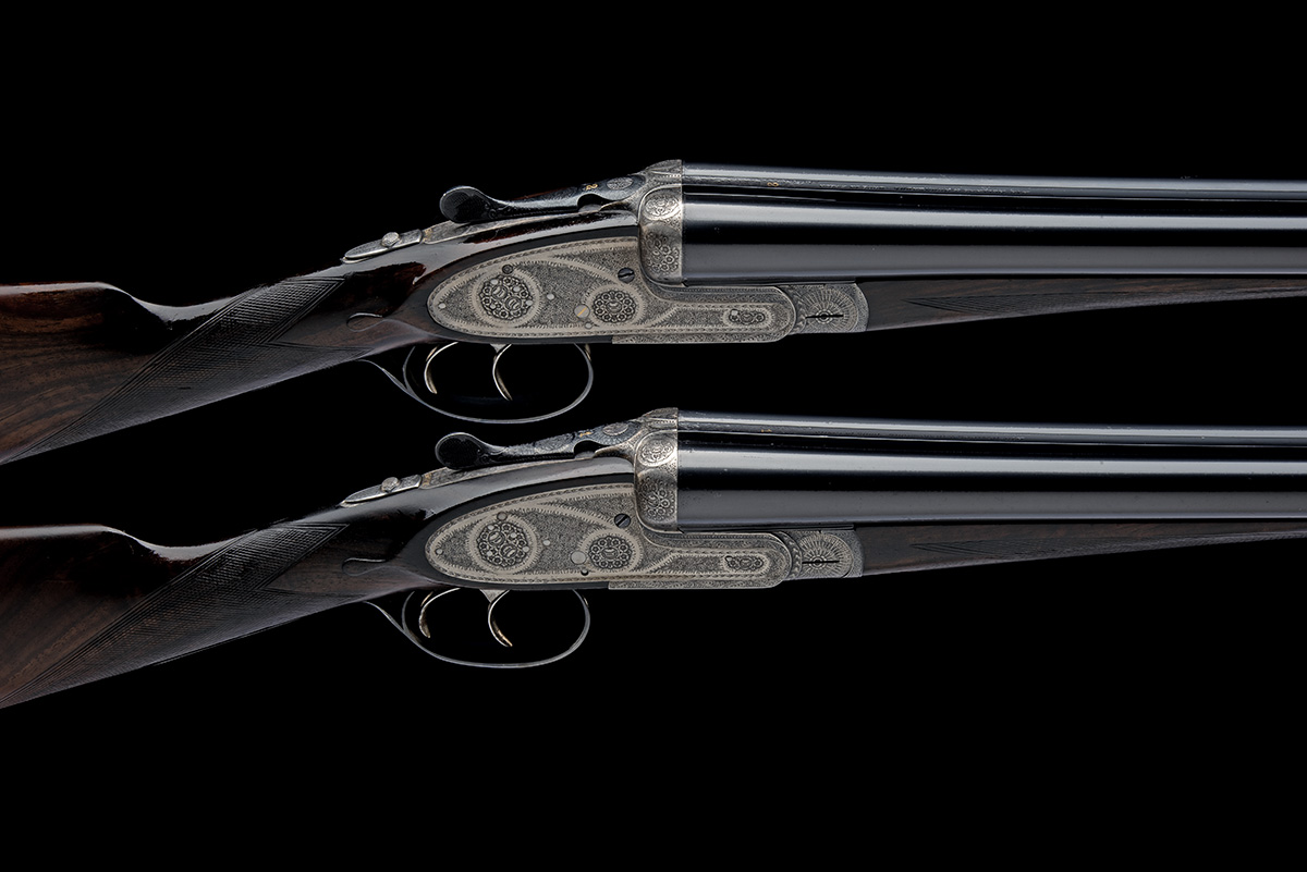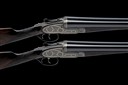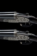 circa 1963, 28in. nitro chopperlump barrels, the ribs gold-inlaid '1' and '2' at the breech ends, 2 1/2in. chambers, bored approx. 1/4 choke in all, some dents, toplevers gold-inlaid '1' and '2', automatic safeties with gold-inlaid 'SAFE' details, removable striker discs, No.1 missing gold inlay on cocking-indicator left side, replacement tumbler right side, No.2 with gold-inlaid cocking-indicators, rolled-edge triggerguards, fine acanthus scroll engraving with floral bouquets, 15in. figured stocks including 7/8in. leather covered recoil pads, No.2 with repaired cracks at hand, weight 6lb. 8oz. (No.1) and 6lb. 10oz. (No.2), in a lightweight leather motor case