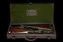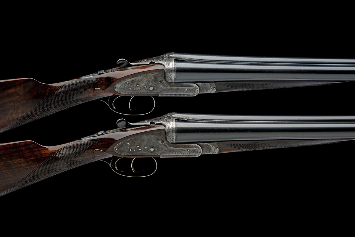 for 1933, 26 1/2in. nitro barrels, sunken ribs engraved 'WILLIAM EVANS. 63. PALL MALL. ST. JAMES'S. LONDON.' and gold-inlaid '1' and '2' at the breech ends, 2 1/2in. chambers, bored approx. imp. cyl. choke in both (No.1) and 1/2 and 1/4 choke (No.2), treble-grip actions with removable striker discs, toplevers with ovals carved in relief and gold-inlaid '1' and '2', the fore-end finials similarly carved, automatic safeties with gold-inlaid 'SAFE' details, fine acanthus scroll engraving with beaded bordering, retaining traces of colour-hardening and finish, 15in. stocks including 7/8in. wooden extensions, weight 6lb. 7oz., in their brass-cornered leather case