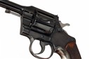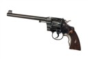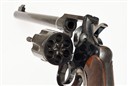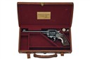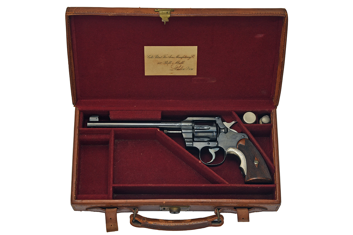 for 1909, with blued tapering 7 1/2in. barrel signed in two lines on the barrel with patent dates to 1905, block and adjustable blade fore-sight, drift adjustable notch rear-sight with locking screw, blued solid frame with fluted swing-out cylinder, polished sides to the hammer, chequered trigger blade and back-strap, finely chequered walnut grips and fitted with a Tylers alloy grip-filler, complete with its maker's leather covered storage case, Colt 15A Pall Mall Depot label inside lid, lined and compartmented in burgundy baize, together with grease and oil bottles
