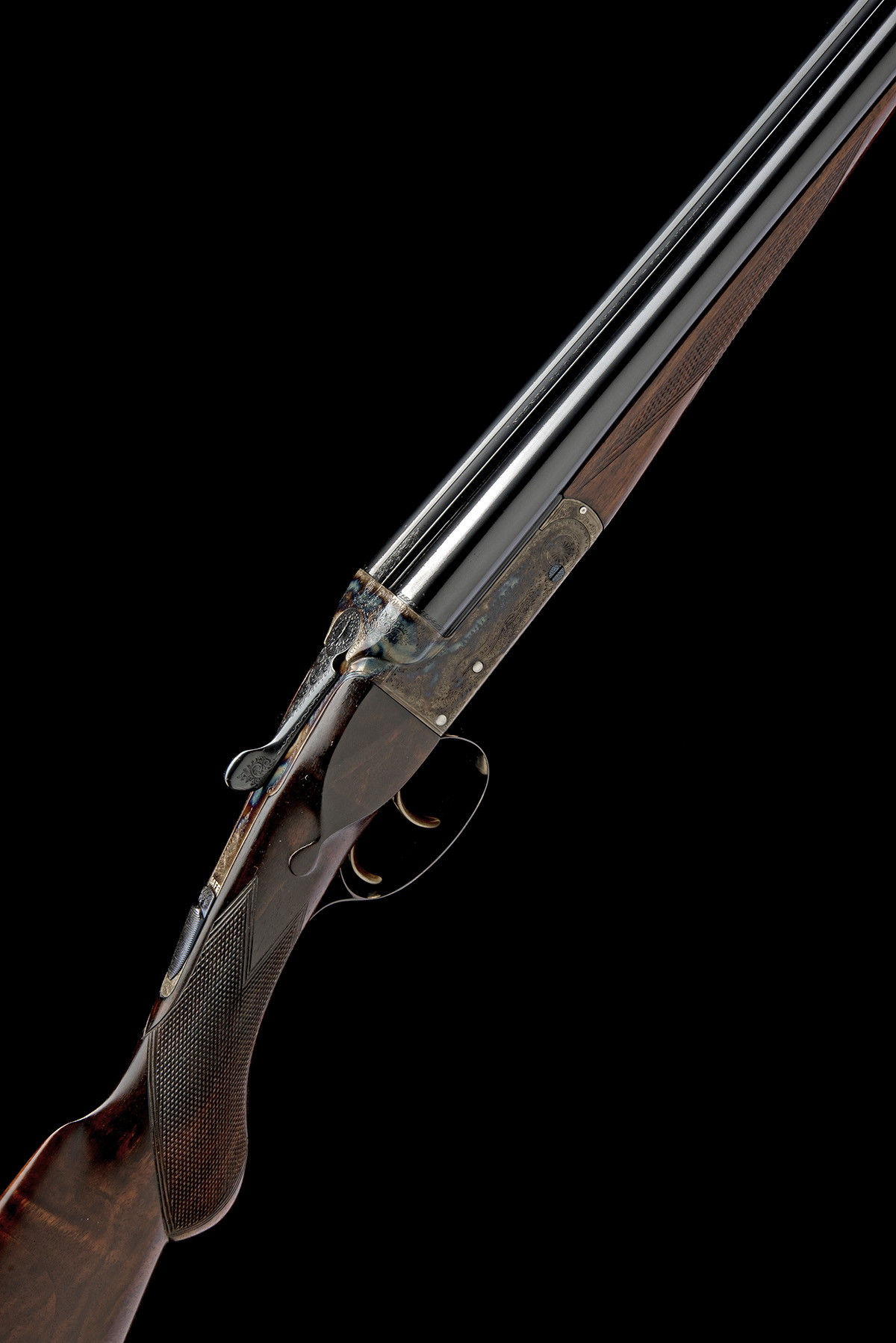 for 1928, 27in. nitro barrels, the rib engraved 'WATSON BROS. GUN MAKERS PALL MALL LONDON.', 2 1/2in. chambers, bored approx. imp. cyl. and 1/4 choke, automatic safety with gold-inlaid 'SAFE' detail, fine acanthus scroll engraving with scrolling banners engraved 'WATSON BROS', retaining virtually full renewed colour-hardening and finish, 14 1/2in. well-figured semi-pistolgrip stock including 1 1/8in. wooden extension, weight 4lb. 9oz., in its lightweight leather 'violin' case
