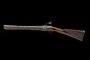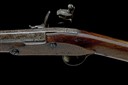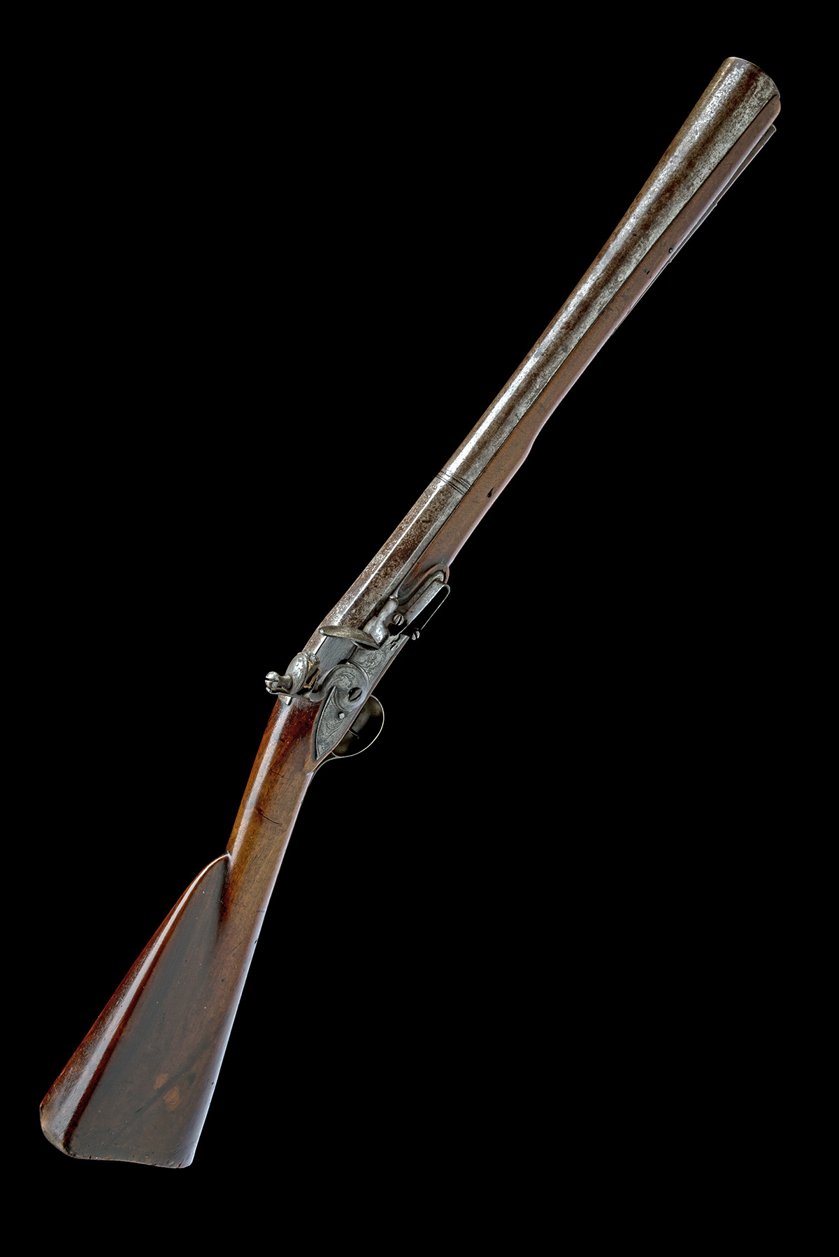 continental, probably Belgian circa 1775, with two-stage octagonal to round 17 1/2in. barrel, moulded band at the intersection, solid squared top-tang, radiused border and foliate scroll engraved lock with swan-necked cock and unbridled frizzen, walnut hand-rail full-stock with broad un-plated heel, brass furniture and brass faced wood ramrod