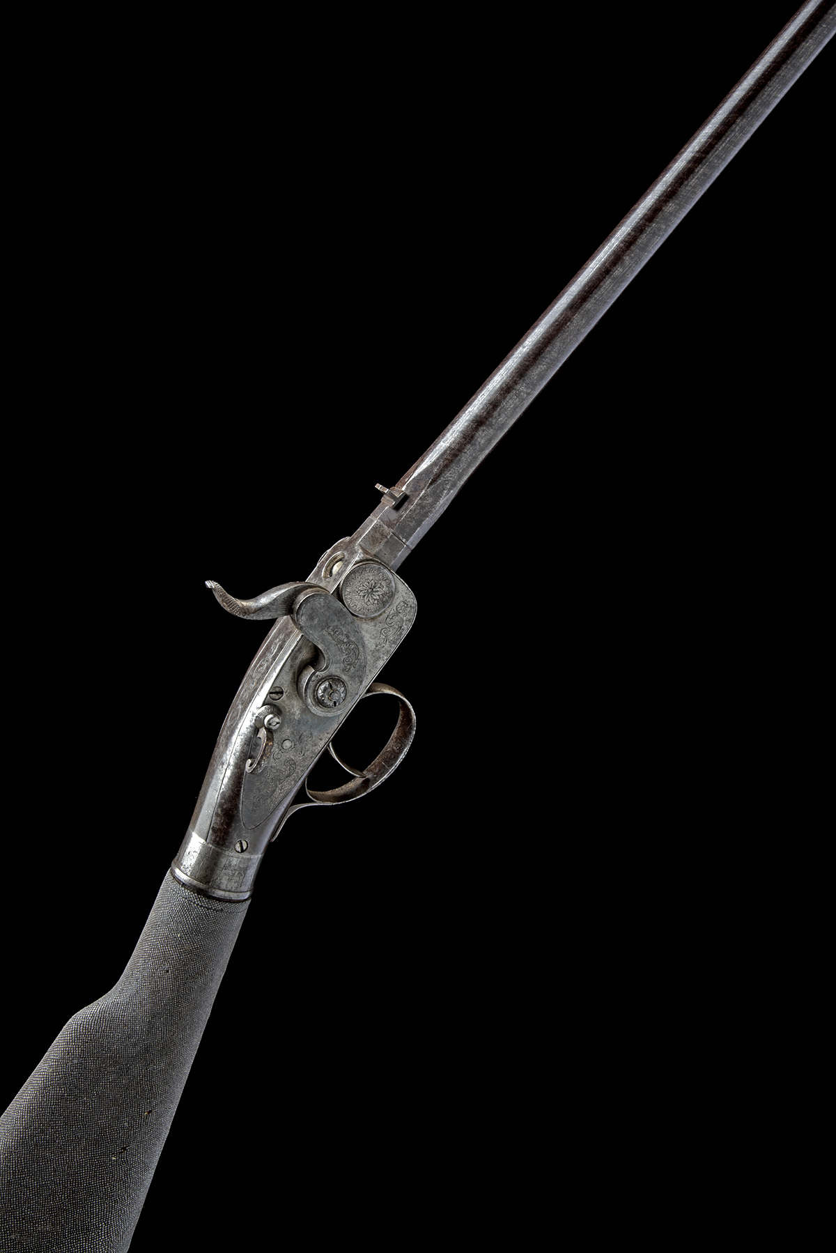 circa 1840, with laminated 29 1/4in. barrel later lined to .22, dove-tailed blade fore-sight, standing notch rear-sight, slab-sided borderline and scroll engraved receiver with tap-action breech and external cocking 'hammer' with swinging safe behind, shagreen covered butt reservoir with later slip-over leather boot and no provision for fore-end, together with an incomplete pump for same (missing foot-plate), the whole in a later abs plastic carry-case