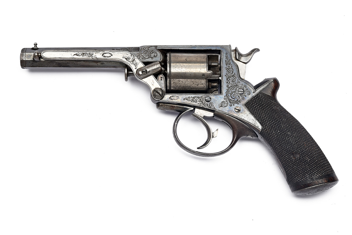 circa 1856, with blued 4 5/8in. octagonal barrel, engraved band at muzzle, scroll-work at throat, the top-strap signed 'ALEX THOMSON & SON, 61 UNION PLACE, EDINBURGH' with scrolled border, borderline and scroll engraved solid frame, plain cylinder with borderline engraving (colour lost), swept chequered walnut grip and hinged rammer, the whole retaining much original blued finish where appropriate