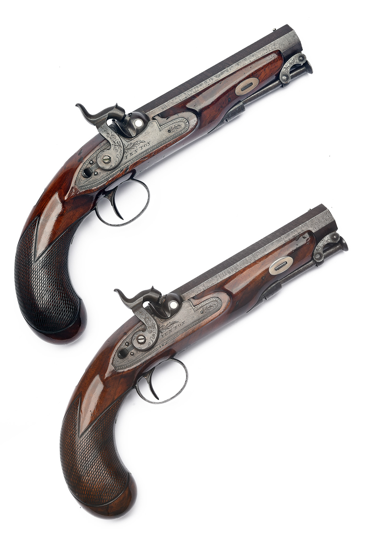 A PAIR OF 40-BORE PERCUSSION OVERCOAT PISTOLS SIGNED FENTON, LONDON, no visible serial numbers,