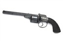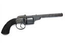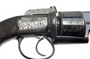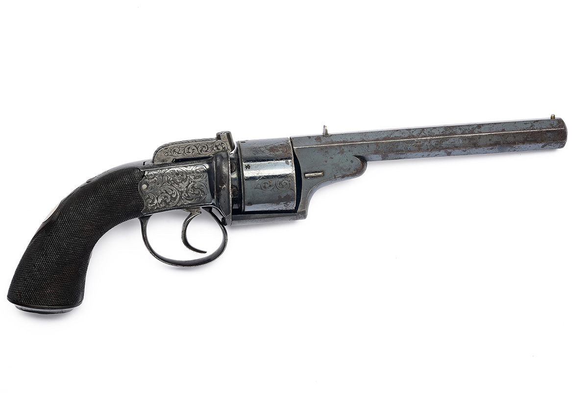 circa 1850, with octagonal 6 1/2in. barrel signed 'DOOLEY, LIVERPOOL' on the top-flat, engraved band to the radiused muzzle, bead fore-sight, standing notch rear-sight, wedge barrel key, plain six-shot cylinder with scroll engraving over each chamber, moulded nipple guard with full under-strap, border and scroll engraved rounded action with offset central bar hammer and guarded trigger, finely chequered walnut grip and moulded grip-cap with central trap, the whole an older London re-blue (some isolated pitting)