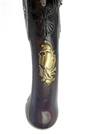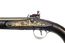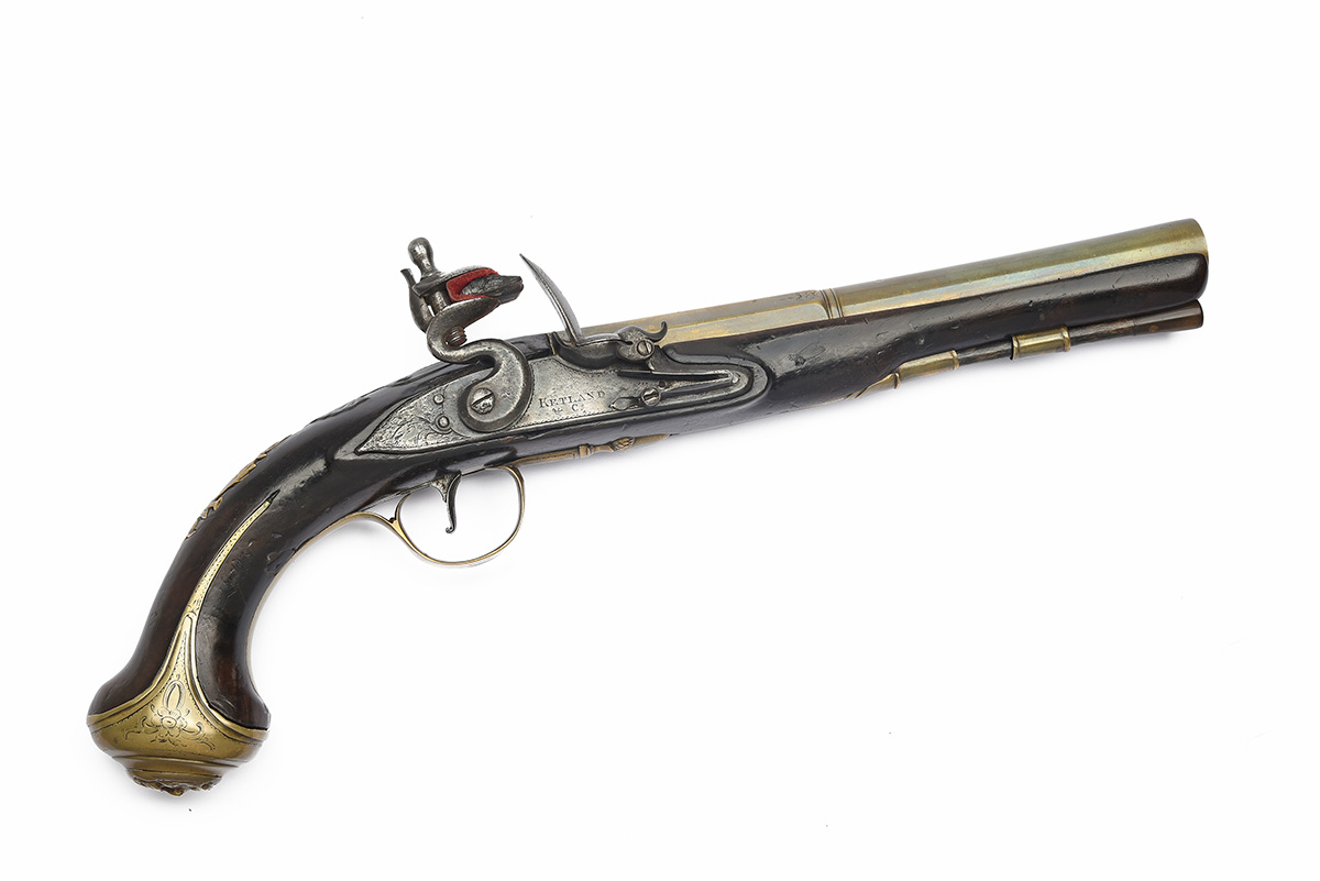 circa 1775, with brass octagonal to round slightly swamped 8in. barrel, moulded band at the intersection and floral engraving to the tip of the top flats, London proofs, solid iron top-tang, flat borderline engraved lock with florally engraved pointed tail and signed 'KETLAND' & CO.' below the shallow pan, working replacement swan-necked cock, walnut full-stock with rococo carved apron around the top-tang, brass furniture including rococo moulded escutcheon, pierced sideplate and long spurred bulbous butt-cap, guarded trigger with acorn finial and horn tipped ramrod