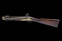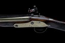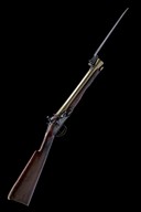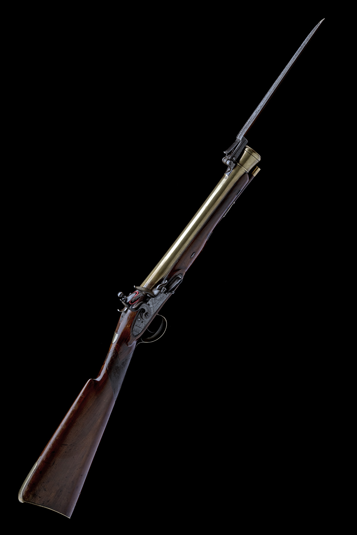 circa 1800, with round 11 3/4in. barrel with flared offset muzzle, the top at breech marked 'LONDON', top-mounted iron bayonet of concave sided triangular form released via a catch on the top-tang, borderline engraved semi bevel-edged lock with stepped tail and signed 'PINKNEY & SON' below the pan, swan necked cock, walnut full-stock chequered at the wrist, cracked through the wood centrally and with period working repair including full brass sideplate, shotgun butt, brass furniture and replacement brass-tipped ramrod