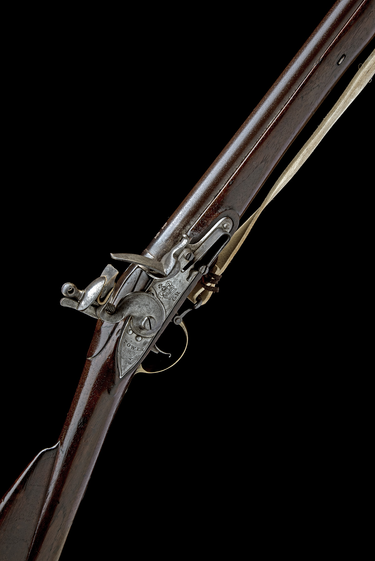 circa 1798, with darkly stained round 39in. barrel, block fore-sight, private proofs and moulded band at breech, squared top-tang, borderline engraved lock with 'G.R.' and crown device below pan and signed 'TOWER' with 'L.M.V.' below, walnut hand-rail full-stock, brass Land Pattern furniture and iron ramrod, fitted with a later buff leather sling