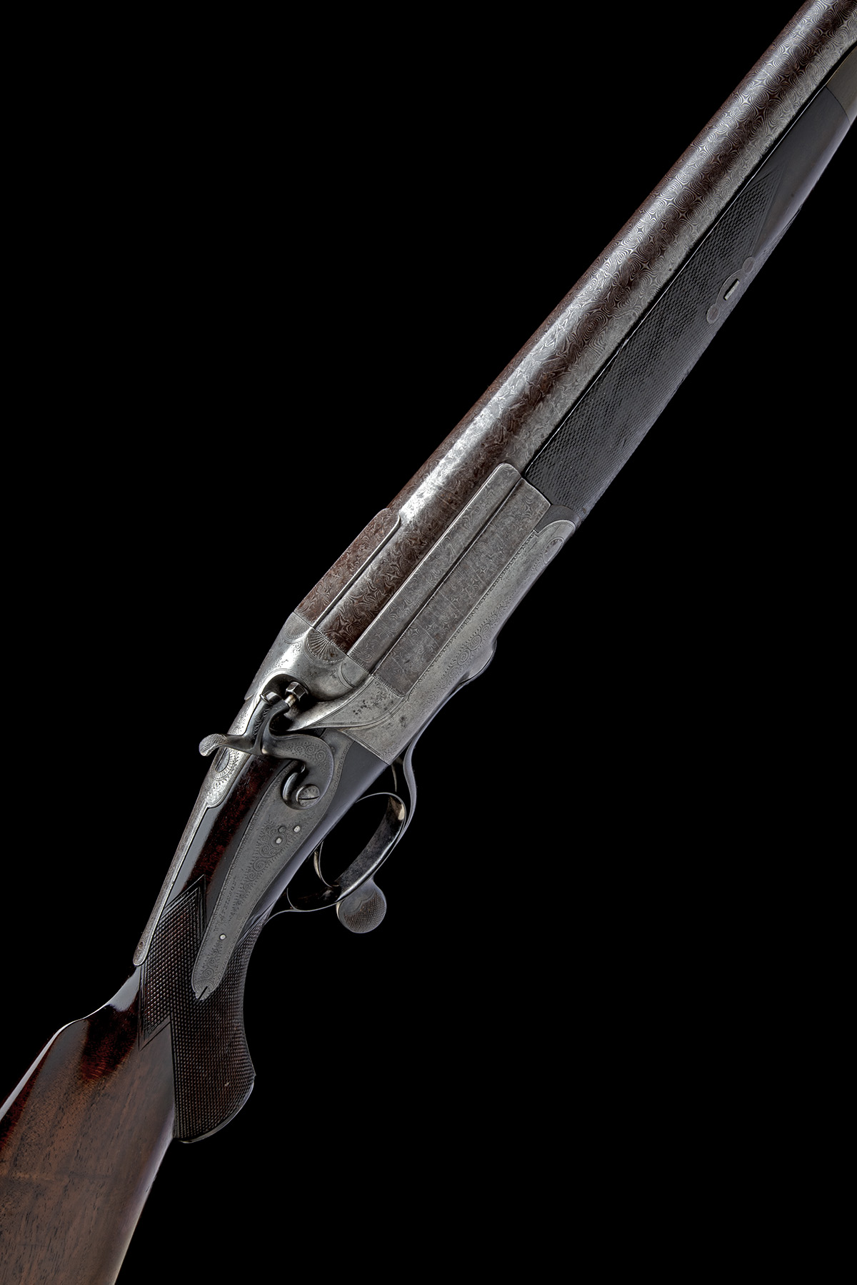 circa 1880, serial number on loop only, 42 1/4in. nitro reproved bold damascus barrel engraved 'WM. ATKINSON. LANCASTER & KENDAL' and with short sight flat at the breech end, carved percussion fence with engraved arcading to the standing breech, Jones patent rotary underlever, rebounding back-action lock, border and acanthus scroll engraving, 14 1/4in. pistolgrip stock with horn pistolgrip-cap, central drilled hole and 7/8in. recoil pad, fore-end with crosspin release and horn finial, weight 14lb.