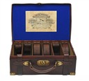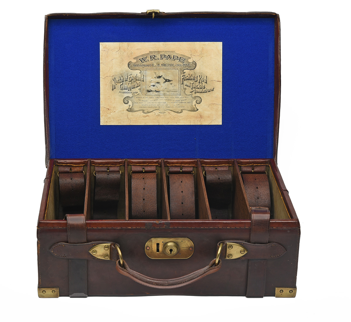 for approx. 500 cartridges, the lid interior lined with blue baize, a W.R. Pape trade label, five oak removable dividers, six leather lifters, brass lock (key missing)
