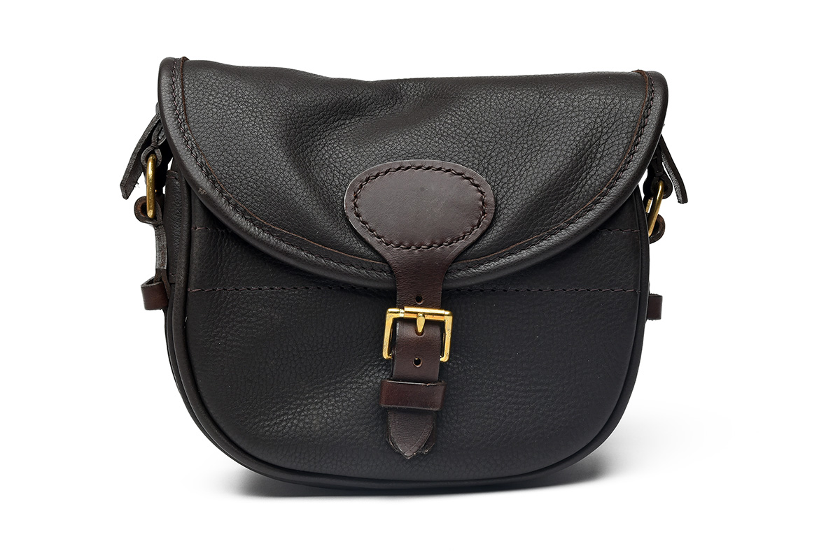 A SUEDE-LINED DARK BROWN LEATHER CARTRIDGE BAG,
