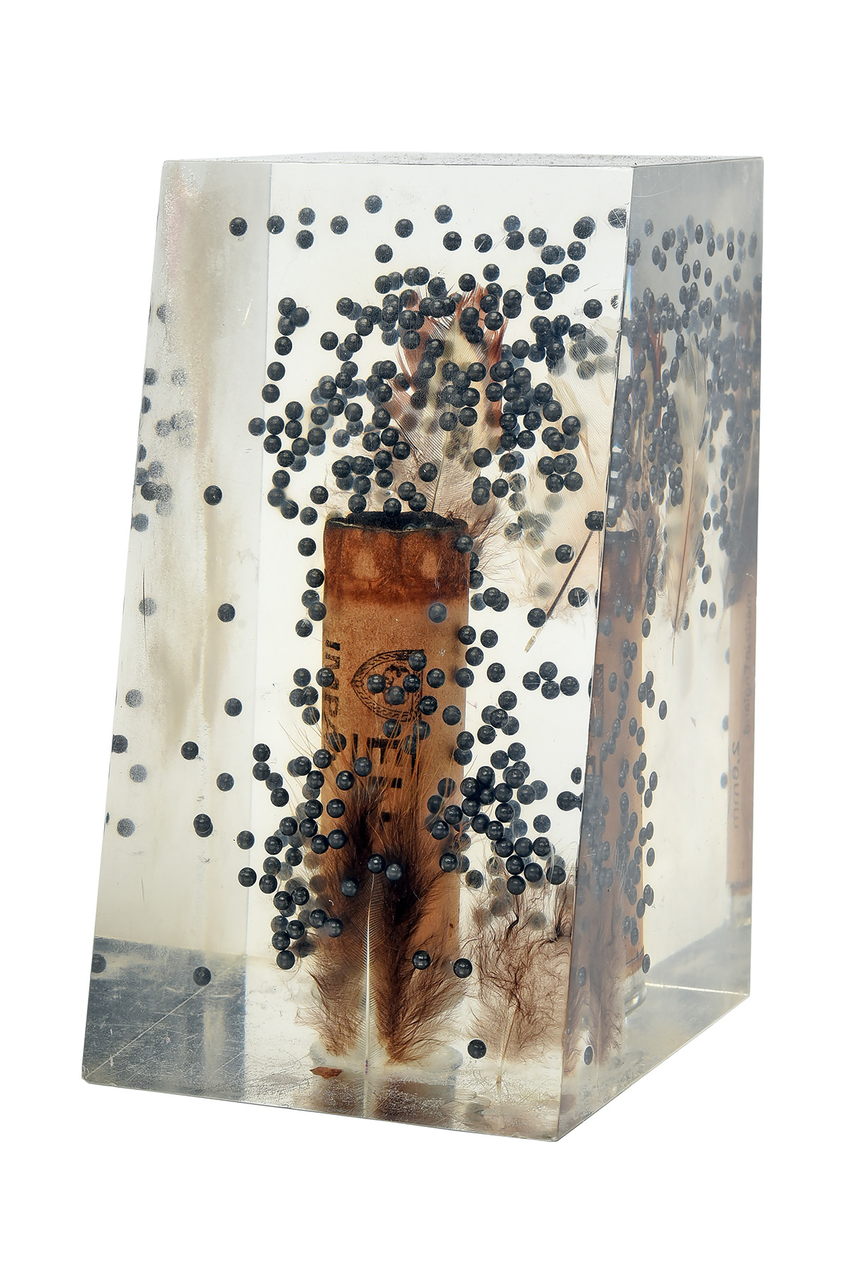 A PAPERWEIGHT OF AN OPENED 12-BORE PAPER-CASE CARTRIDGE WITH SHOT AND FEATHER,