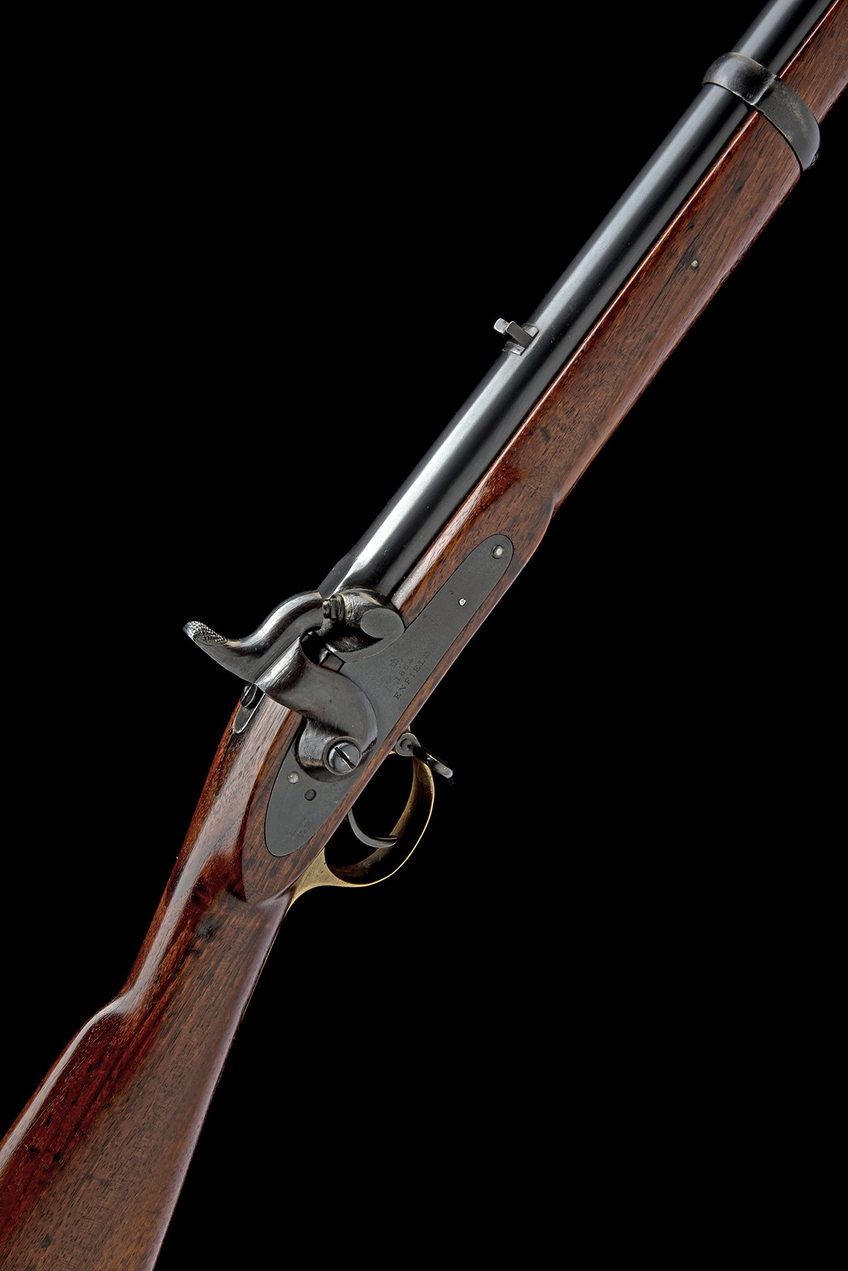 dated for 1864, with reblued 39in. barrel, block and blade fore-sight, fixed standing notch rear-sight, ordnance and farsi marks at breech, later re-proof for blank, plain lock signed 'ENFIELD' below the date, 'I' and broad arrow stamp, and 'V.R.' with crown device at tail, walnut full-stock, brass furniture and three blued iron barrel-bands, refinished, with jag-ended ramrod