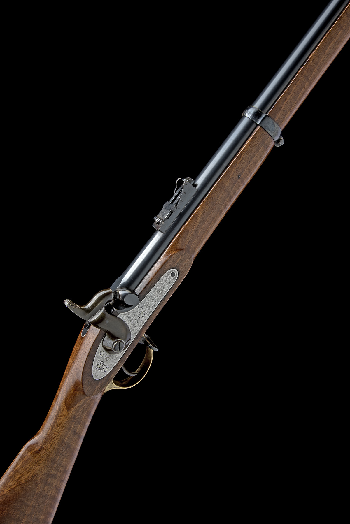 the rifle dated for 1860, with reblued 39in. barrel, block and blade fore-sight, elevating ladder rear-sight, ordnance marks and 'LAC.Co' stamps at breech, plain lock signed 'L.A.C.Co.' below the date, 'V.R.' and crown device at tail, walnut full-stock, brass furniture and three blued iron barrel-bands, refinished, with jag-ended ramrod and a period socket bayonet for same, no scabbard