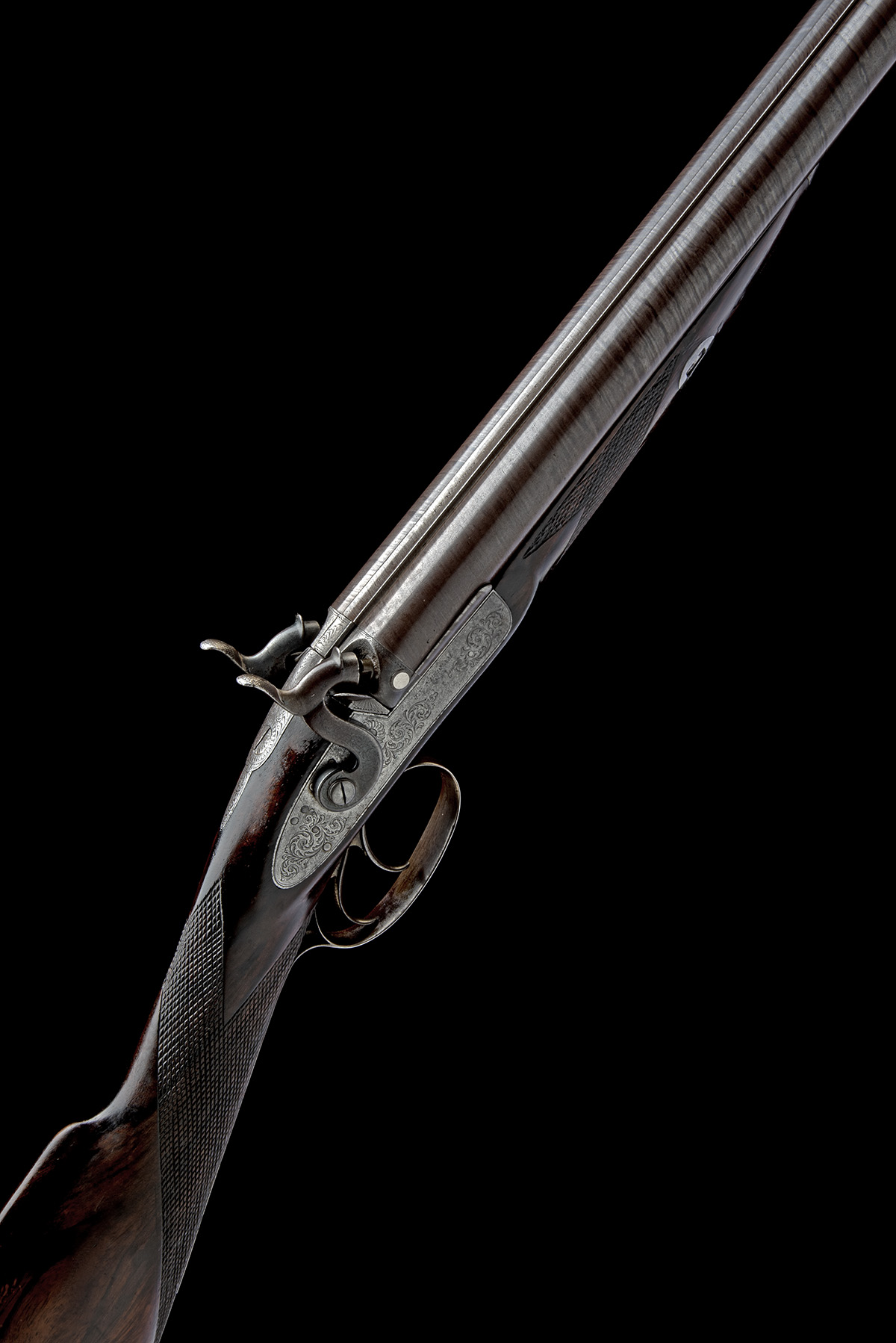 circa 1855, with 30in. barrels marked 'J.V. NEEDHAM, 27 CANON ST, BIRMINGHAM' (renewed), bead fore-sight, engraved band at breech and with platinum plugs, scroll engraved top-tang, borderline and scroll engraved bar-action locks signed 'J.V. NEEDHAM' (rubbed), chequered walnut half-stock, iron furniture and brass-tipped wood ramrod