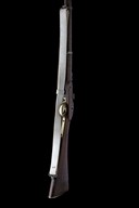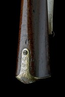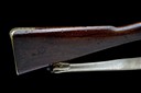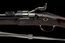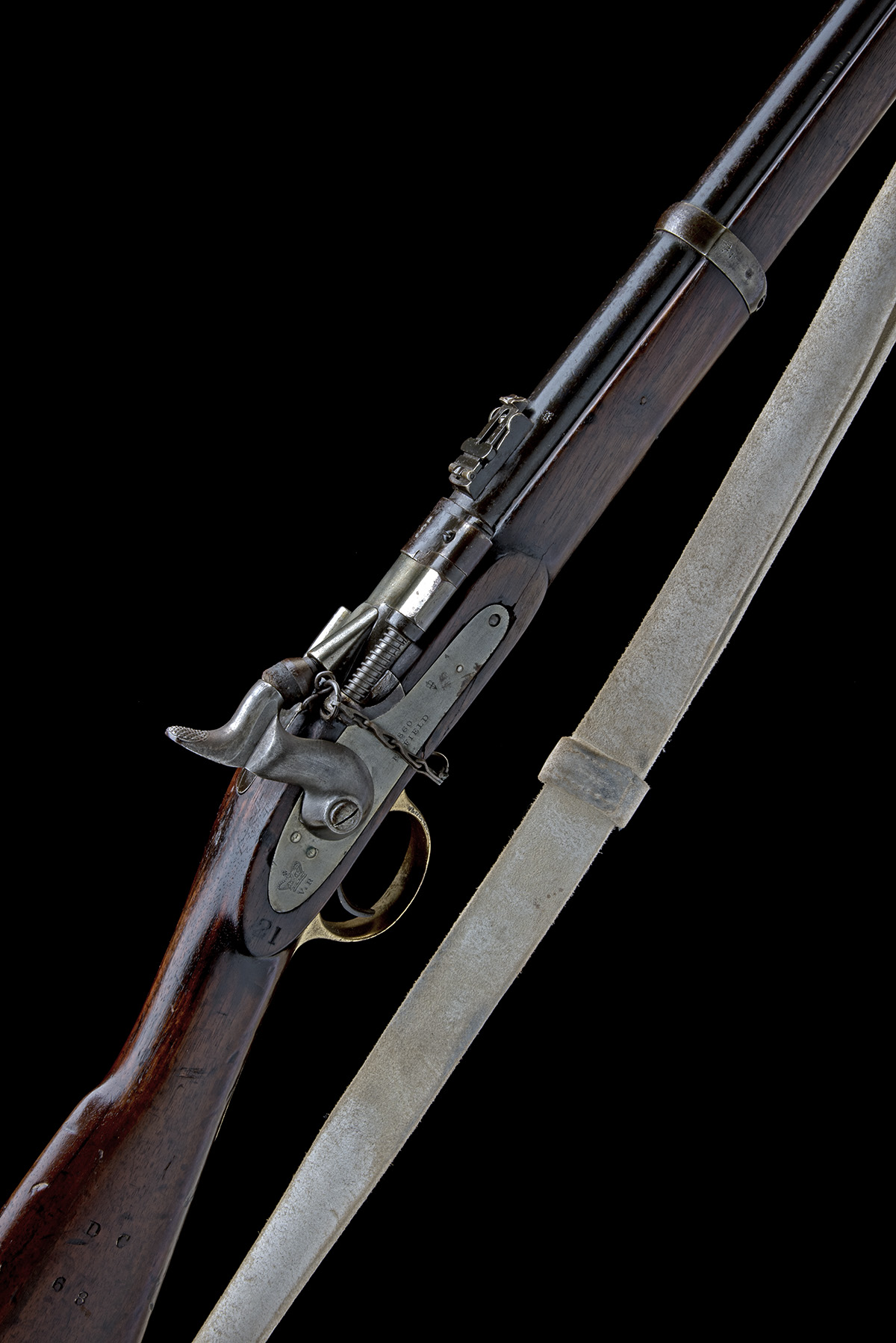 dated for 1860, with blued 21 1/2in. barrel, block and blade fore-sight, carbine size ladder rear-sight, flip-open breech with solid thumb-catch, plain lock marked 'ENFIELD' below the date and with a 'V.R.' crown device at tail, walnut three-quarter stock (blind crack below lock-bar) brass furniture, the heel-plate spur marked '6BY' above '7BE' above 'RL. AY.' above the number '46', two iron barrel-bands, bayonet lug to right side of muzzle, jag-ended clearing rod, fitted with a chained pin protector and a later buff leather sling, stock and furniture with bruising