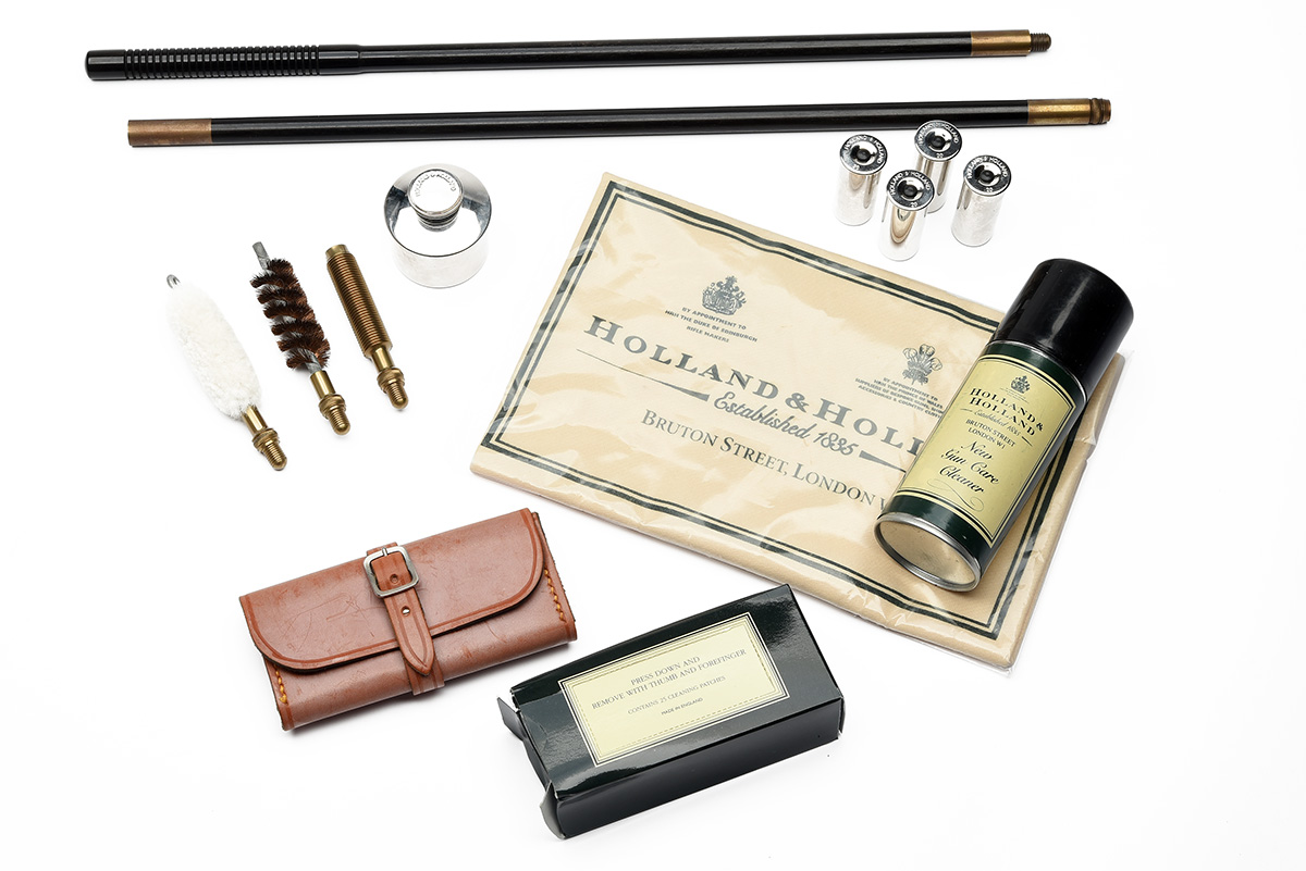 comprising a two-piece cleaning rod, two pairs of 20-bore snap-caps, oil bottle (all signed (Holland & Holland), cleaning heads, gun-cleaning patches, new care cleaner and a Holland & Holland Selvyt cloth