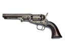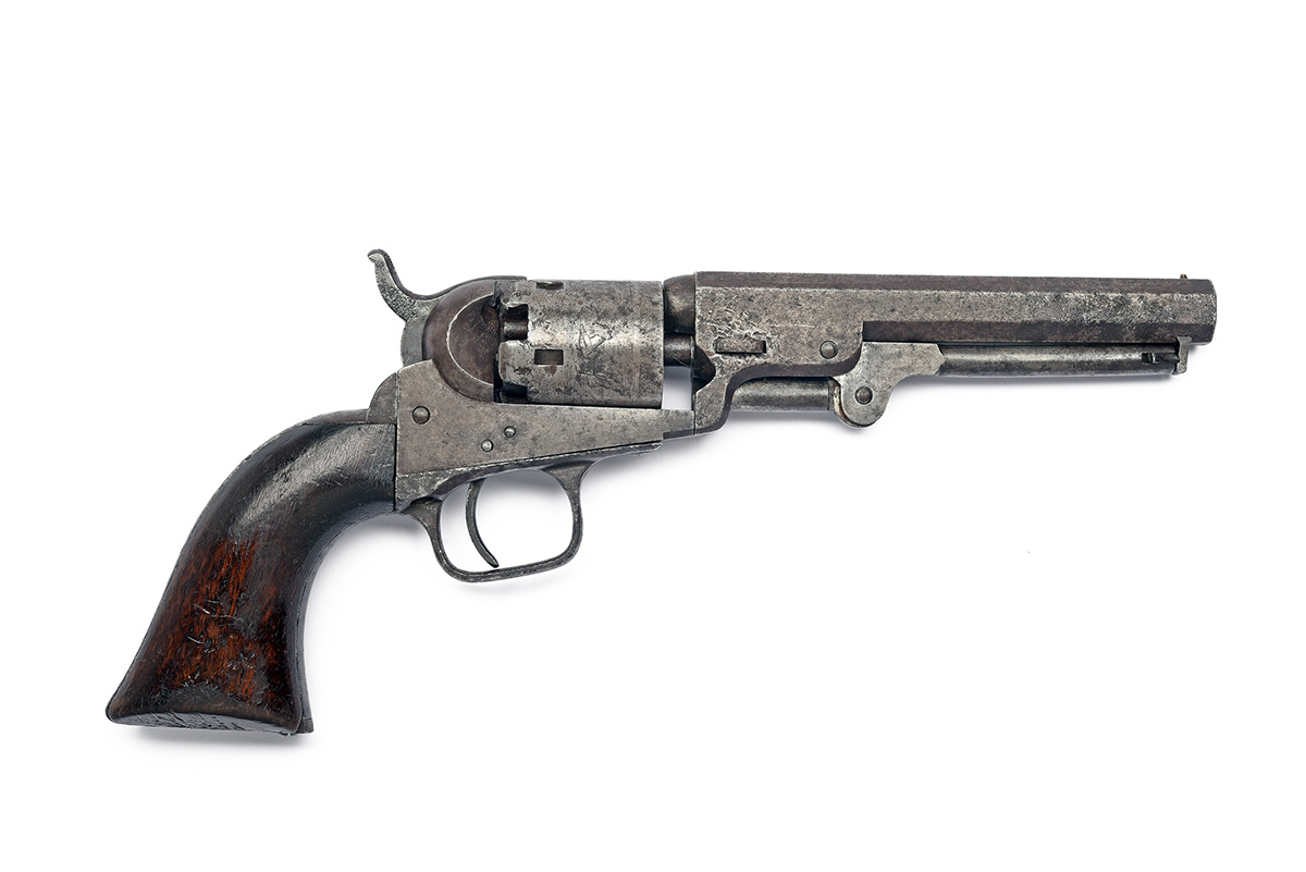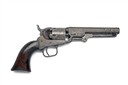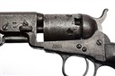 for 1855, with octagonal 5in. barrel signed on the top-flat 'ADDRESS COL COLT LONDON' within brackets on two lines, open iron frame, roll engraved five-shot cylinder, iron grip-straps and trigger guard, smooth flared walnut one-piece grip and articulated under-barrel rammer, slight traces only of finish, all matching numbers