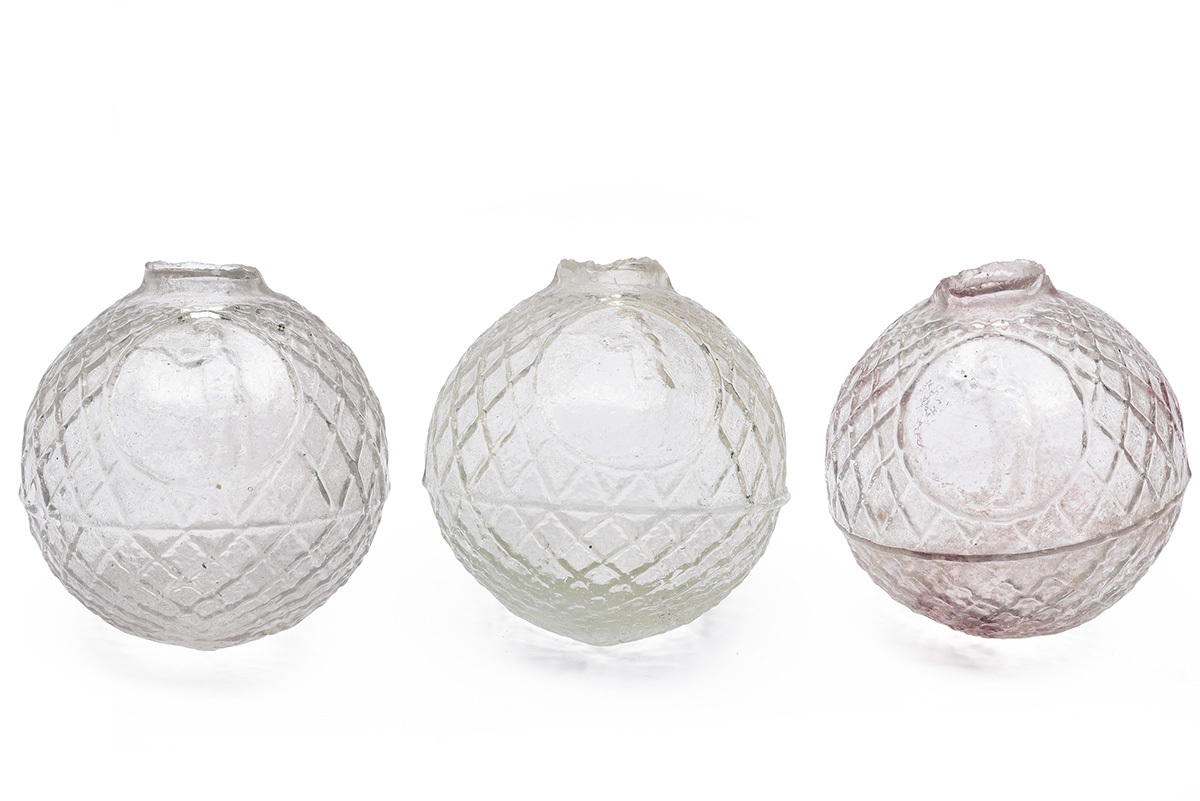 THREE LATE 19TH CENTURY BOGARDUS TYPE CLEAR GLASS BALL TARGETS,