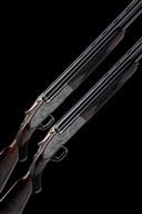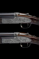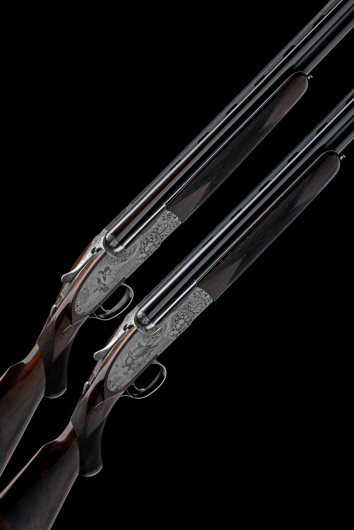 for 1991, 27in. nitro chopperlump barrels with tapered raised ventilated file cut top-ribs, gold-inlaid at the breech ends '1' and '2', side ribs, the over barrels engraved 'J. PURDEY & SONS. LONDON. ENGLAND.', 2 3/4in. chambers, multichokes (with spares), hold-open toplevers gold-inlaid '1' and '2', short side bolsters, automatic safeties with gold-inlaid 'SAFE' details, gold-inlaid cocking-indicators, non-selective single triggers, rolled-edge triggerguards, the action bodies and furniture carved in high relief with bold stylised foliage and leaf motifs on a finely matted background, the undersides with central scrolling banners engraved 'J. PURDEY & SONS', the lockplates finely engraved with scenes of game birds in their natural settings, No.1 gun with pheasant on the left and red grouse on the right, the No.2 gun with French partridge on the left and duck on the right, each scene signed 'P. COGGAN', the triggerguard tangs gold-inlaid with the serial numbers, 14 3/4in. highly-figured replacement pistolgrip stocks (by the makers in 2019) with engraved steel pistolgrip-caps, weight 6lb. 11oz., in their brass-cornered oak and leather case with complement of accessories and a canvas and leather outer cover
