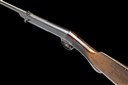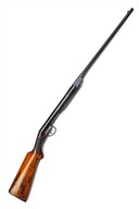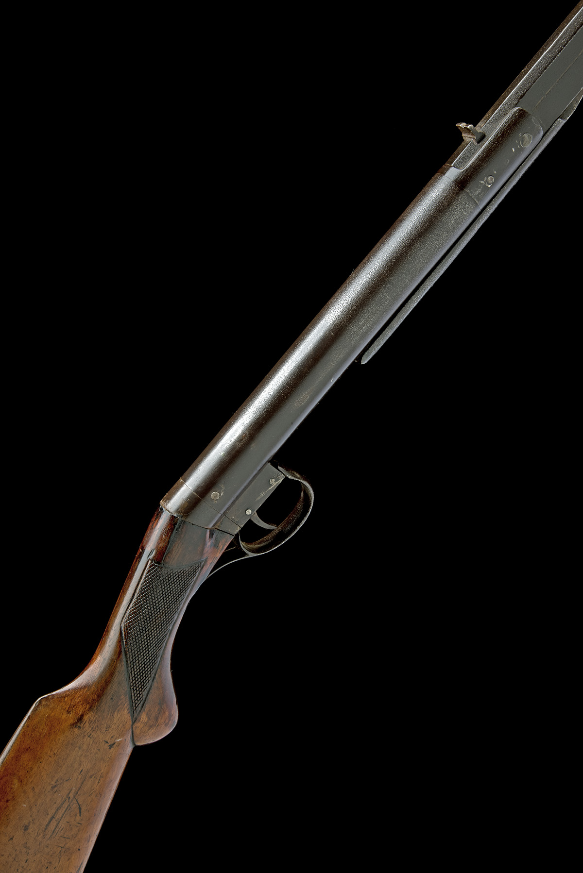 circa 1908, with octagonal to round 19 3/4in. barrel, dove-tailed fore-sight, standing notch rear-sight, plain air-chamber with pull-back side-mounted barrel locking catch, chequered walnut half pistol-grip butt-stock, iron furniture and no provision for fore-end, exposed iron surfaces shallow frosted