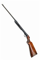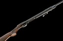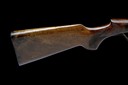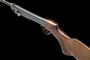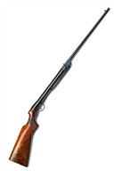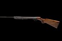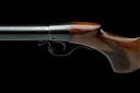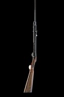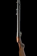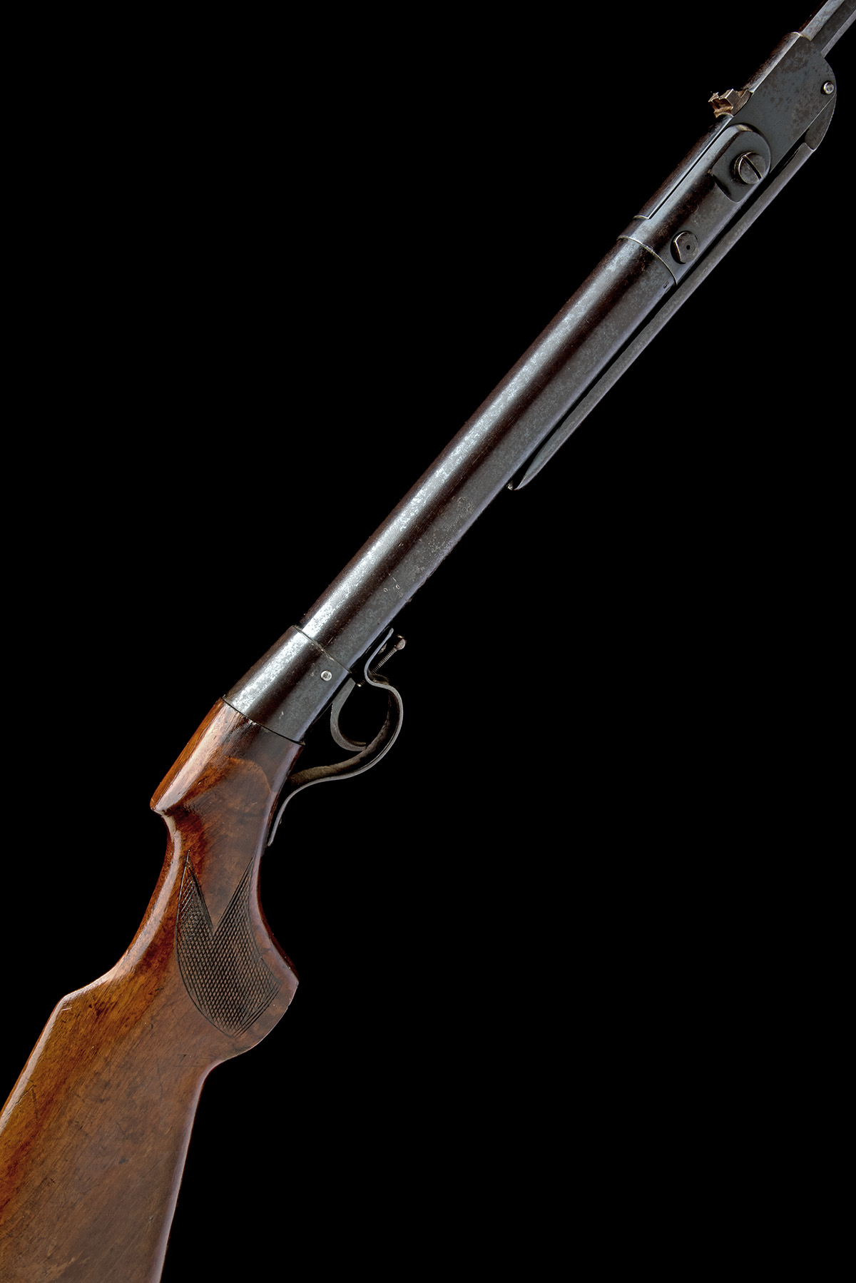 circa 1935, with octagonal to round 18 3/4in. barrel, dove-tailed fore-sight, elevating notch rear-sight, stepped air-chamber with narrowed bolted barrel-jaws and cam-action locking lever mounted to the left side, flared trigger unit, chequered walnut pistol-grip saw-handled butt-stock, iron heel-plate, trigger adjustment screw to front of guard and no provision for fore-end, strong traces of finish