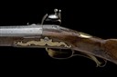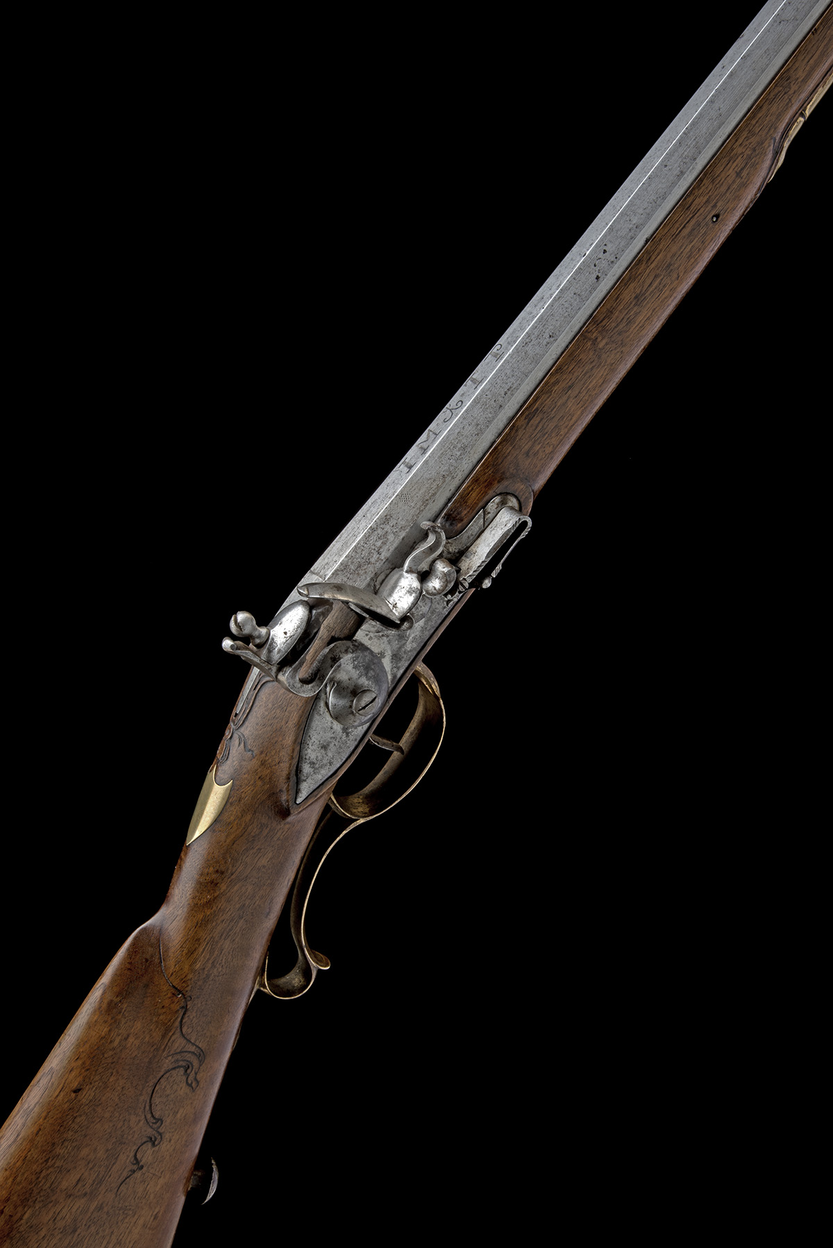 circa 1740, with octagonal swamped 32 1/2in. barrel signed in white metal on the top-flat 'I.M.A.T.P' (possibly Old Cyrillic) and rifled in straight grooves, lined touch-hole, solid top-tang, plain radiused lock with bevel-edged bar, broad carved frizzen-spring, semi rain-proof pan and swan-necked cock, walnut full-stock with carved and moulded margins around the ramrod channel, furniture, cheek-piece and top-tang, brass furniture (strong traces of gilding) and wood ramrod