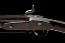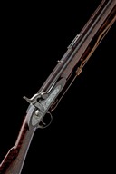 circa 1853, with ovoid 34in barrel, the flat sighting plane signed 'WESTLEY RICHARDS LONDON, shallow block and blade fore-sight, elevating ladder rear-sight marked 'WESTLEY RICHARDS REGISTERED 1852' (some details absent because of the central slide cut-out), additional fixed notch standing rear-sight, borderline engraved top-tang, borderline engraved military style lock signed 'WESTLEY RICHARDS', plain hammer with chequered spur, walnut full-stock, the fore-end held via two un-escutcheoned barrel-keys, iron furniture including swivels and cup-ended ramrod, fitted with a period leather sling, strong amount of finish remaining