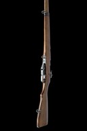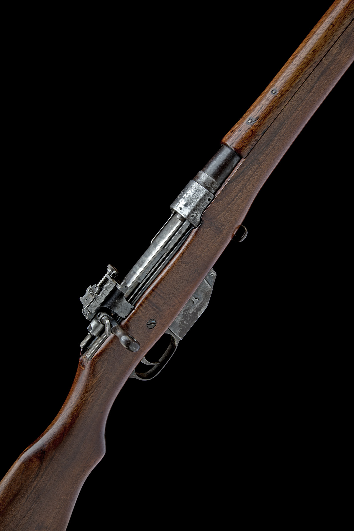 for 1914, 31 1/2in. nitro reproved barrel, block and blade fore-sight, receiver fitted with a flip-up adjustable aperture / notch sight, receiver ring marked 'ROSS RIFLE CO. CANADA. M-10. PATENTED.', bolt with manual safety marked 'SAFE' and 'READY', traces of colour-hardened finish remaining, full stock with top-cover, single barrel band, the right side marked '5/K/63 III. 892?/1914 DE', 13 1/8in. pull including steel buttplate, sling swivels, weight 9lb. 10oz.