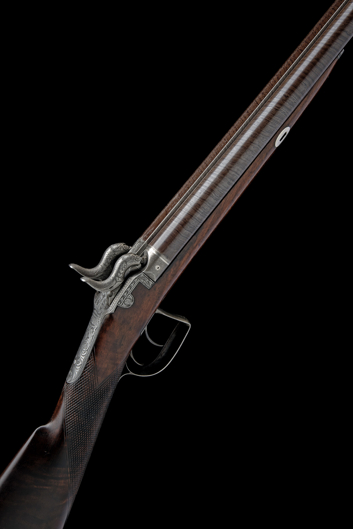 A CASED EARLY 16-BORE PERCUSSION RIVIERE PATENT DOUBLE-BARRELLED SPORTING GUN, serial no. 10,