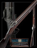 circa 1825-30, with 30in. browned laminated barrels signed 'RIVIERE LONDON' on the rib, colour hardened breeches each with single inlaid platinum line and pierced platinum plug engraved with a rosette, the rib between engraved with a feathered vase, one-piece standing breech and action cover engraved with broad borders and chiselled foliage, a standing figure of a conquistador wearing a morion and holding a halberd in one hand a shield in the other marked 'RIVIERE PATENT 10' with a mail coat hanging in the background, well refinished walnut half-stock with chequered grip, engraved iron mounts including flat-fronted trigger-guard engraved with stylised acanthus leaves inhabited by a feathered serpent, trigger-plate with broad finial engraved with a stylised native chieftain flanked by two supporters and butt-plate engraved with a figure of a contemporary hunter cradling a gun and drinking from a flask to the top-spur, white metal barrel-key escutcheons, and original brass-mounted ramrod with worm, London proof marks, in its blue velvet-lined mahogany guncase with parchment maker's label inside lid and including a shot-flask, oil-bottle, nipple-key and turn-screw