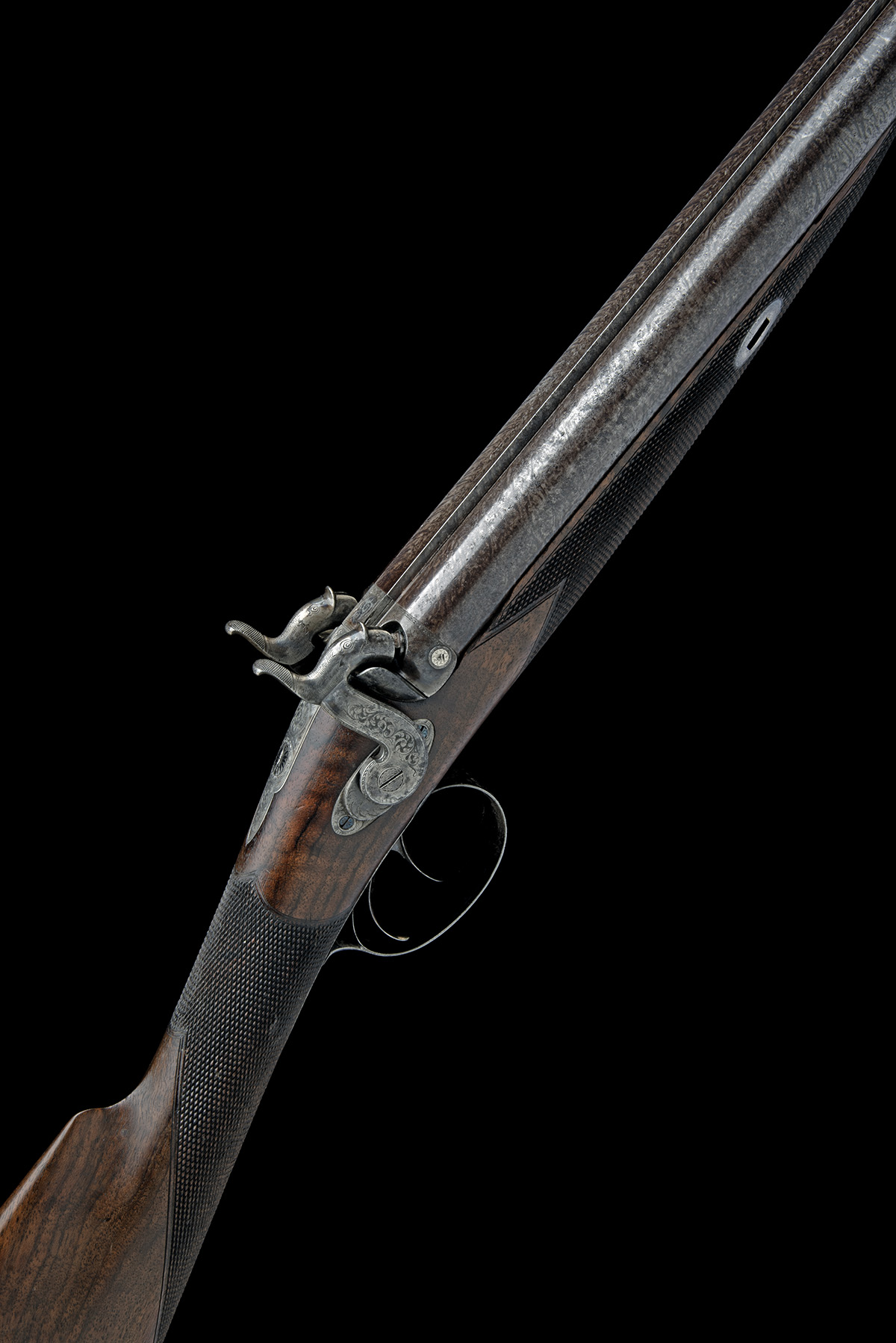 CHARLES JONES, LONDON A RARE CASED 12-BORE PERCUSSION DOUBLE-BARRELLED SPORTING GUN WITH PATENT WATERPROOF LOCK, serial no. 330,