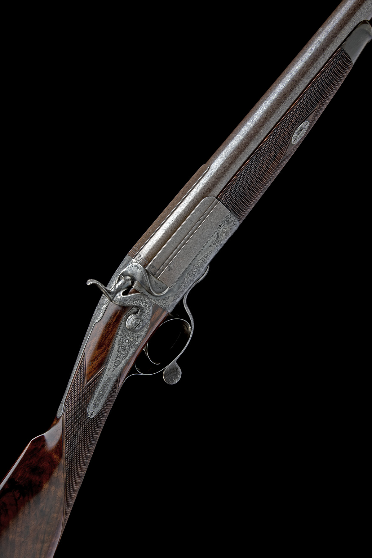 circa 1868, with fine damascus 36in. barrel, the short sighting rib at breech signed 'F. GATES 4 MARKET HEAD, DERBY', broad engraved band at breech, rounded border and scroll engraved swing-underlever action including fully engraved long top-tang and shallow moulded fence, border and scroll engraved colour hardened lock signed 'F. GATES' and with fully scroll engraved hammer body with dolphin engraved head, figured chequered walnut straight hand butt-stock, leather covered rubber pad and chequered walnut fore-end held with a cross key and with moulded horn tips, much finish remaining