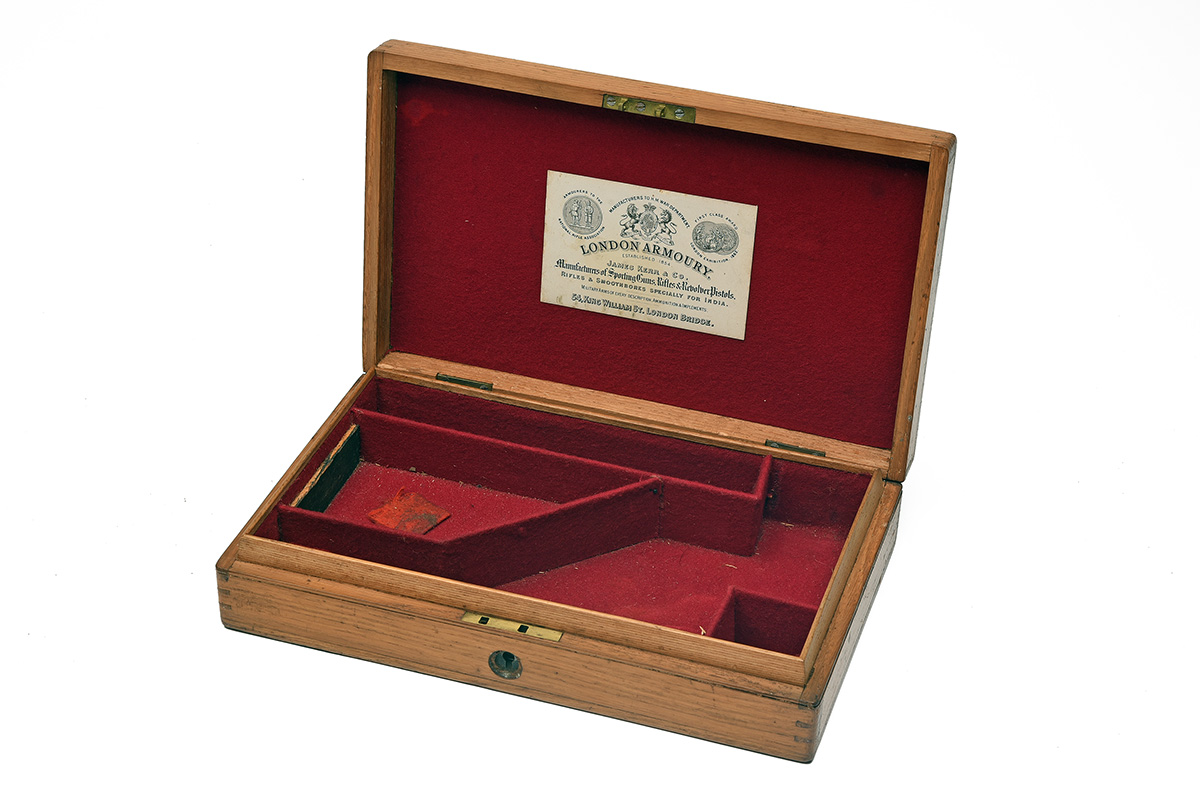 AN OAK PISTOL CASE WITH LONDON ARMOURY TRADE LABEL,