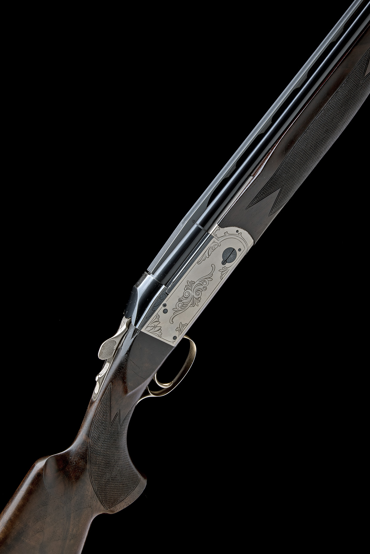 for 2000, 30in. nitro barrels with tapered raised matt top-rib, intermediate bead sight and high visibility fore-sight, 3in. chambers, multichokes (with spares), hold-open toplever, manual safety, triggerplate mounted barrel selector toggle, border and acanthus scroll engraving, blued and satin silver finish, 14 7/8in. pistolgrip stock with ambidextrous palm swell and including an adjustable sprung alloy and rubber recoil pad, weight 9lb. 2oz., in its velveteen lined alloy flight case