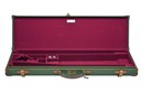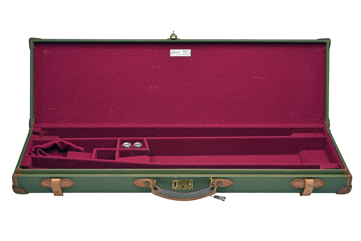 fitted for 30in. barrels, maroon baize interior, brass lock with two keys, leather fixing straps
