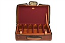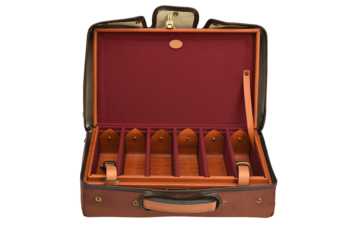 for approx. 250 cartridges, five dividers, six leather lifters, brass lock (key missing), leather carry handle, canvas outer