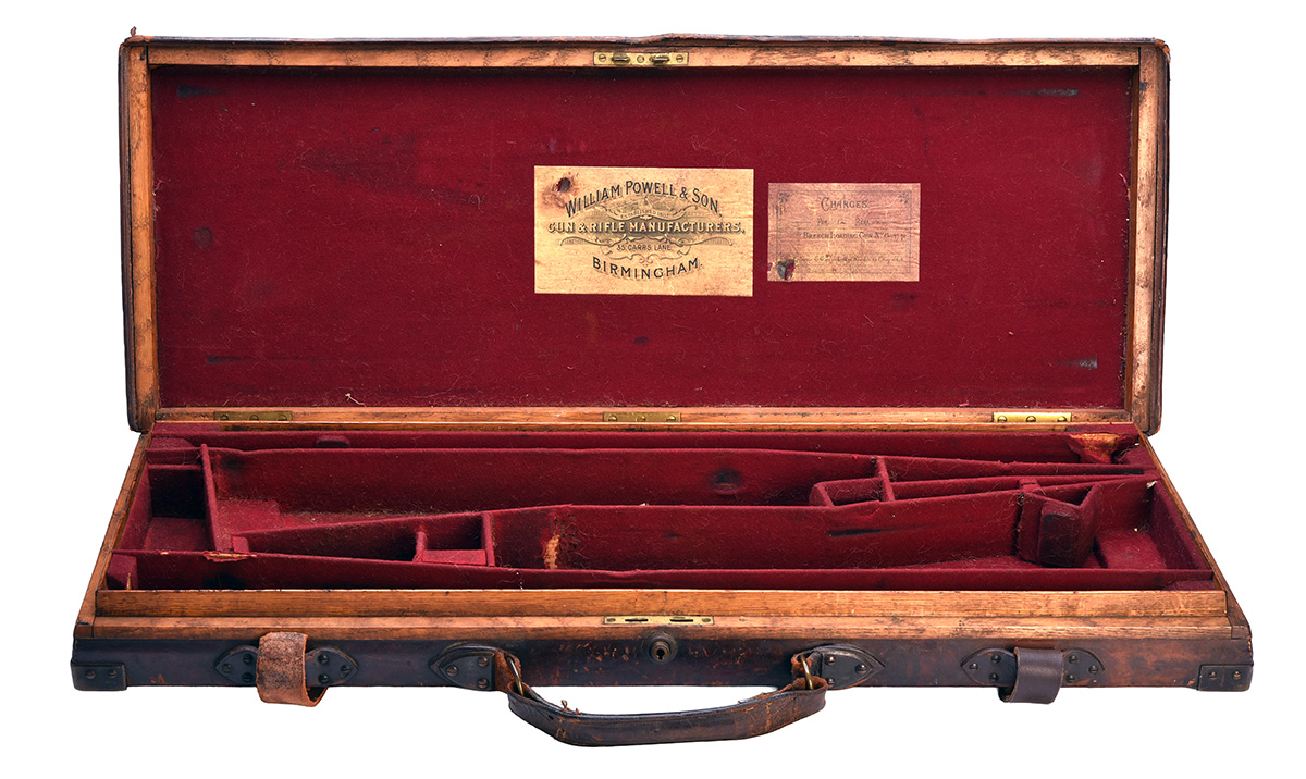 fitted for 29in. barrels, the interior lined with maroon baize, a William Powell & Son trade label, brass lock (key missing), the lid exterior marked 'J.K.'