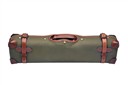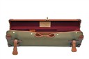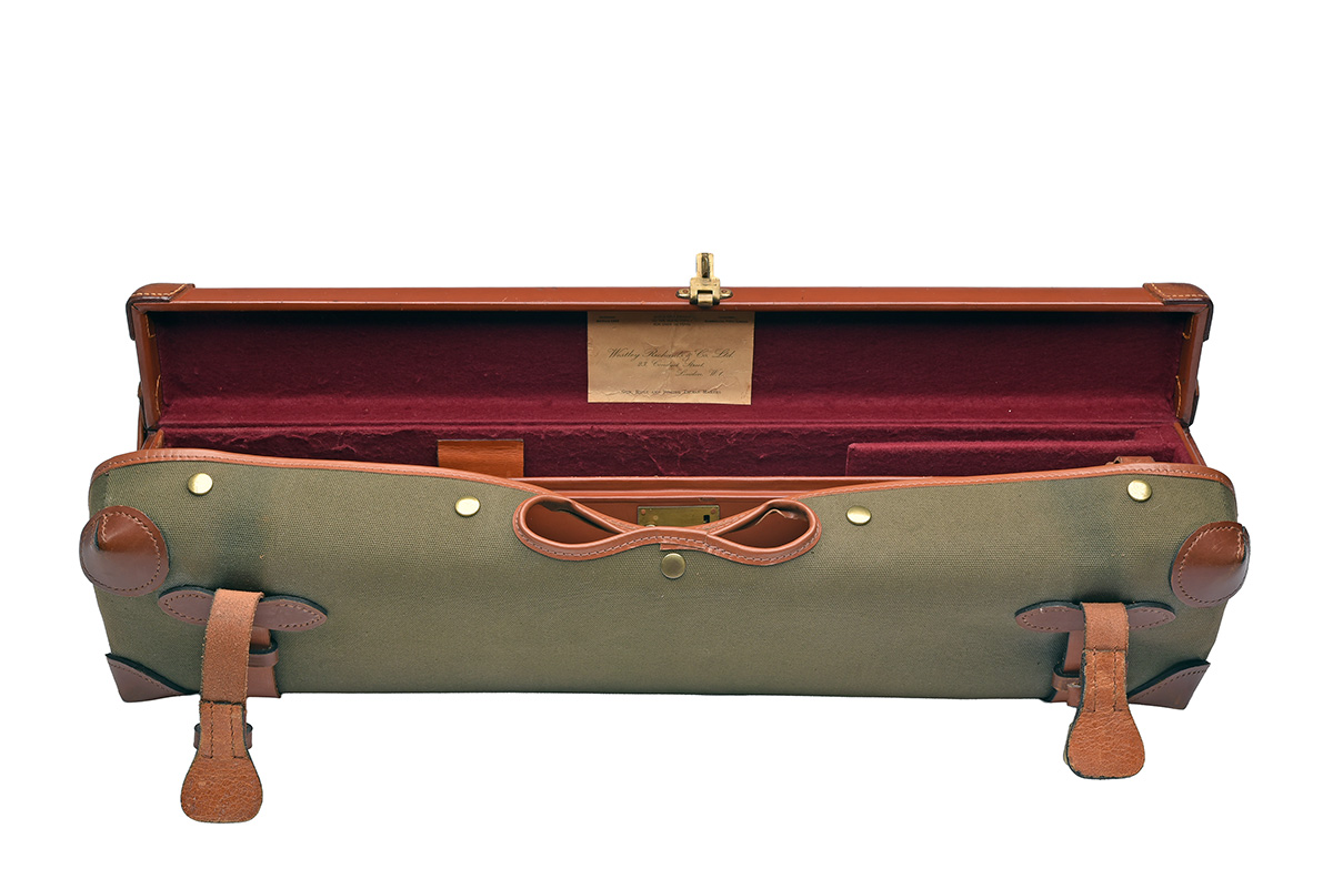 fitted for 25in. barrels (could adapt to 26in.), the interior lined with maroon baize, a Westley Richards trade label, brass lock (key missing)< leather carry handle, green canvas and leather outer